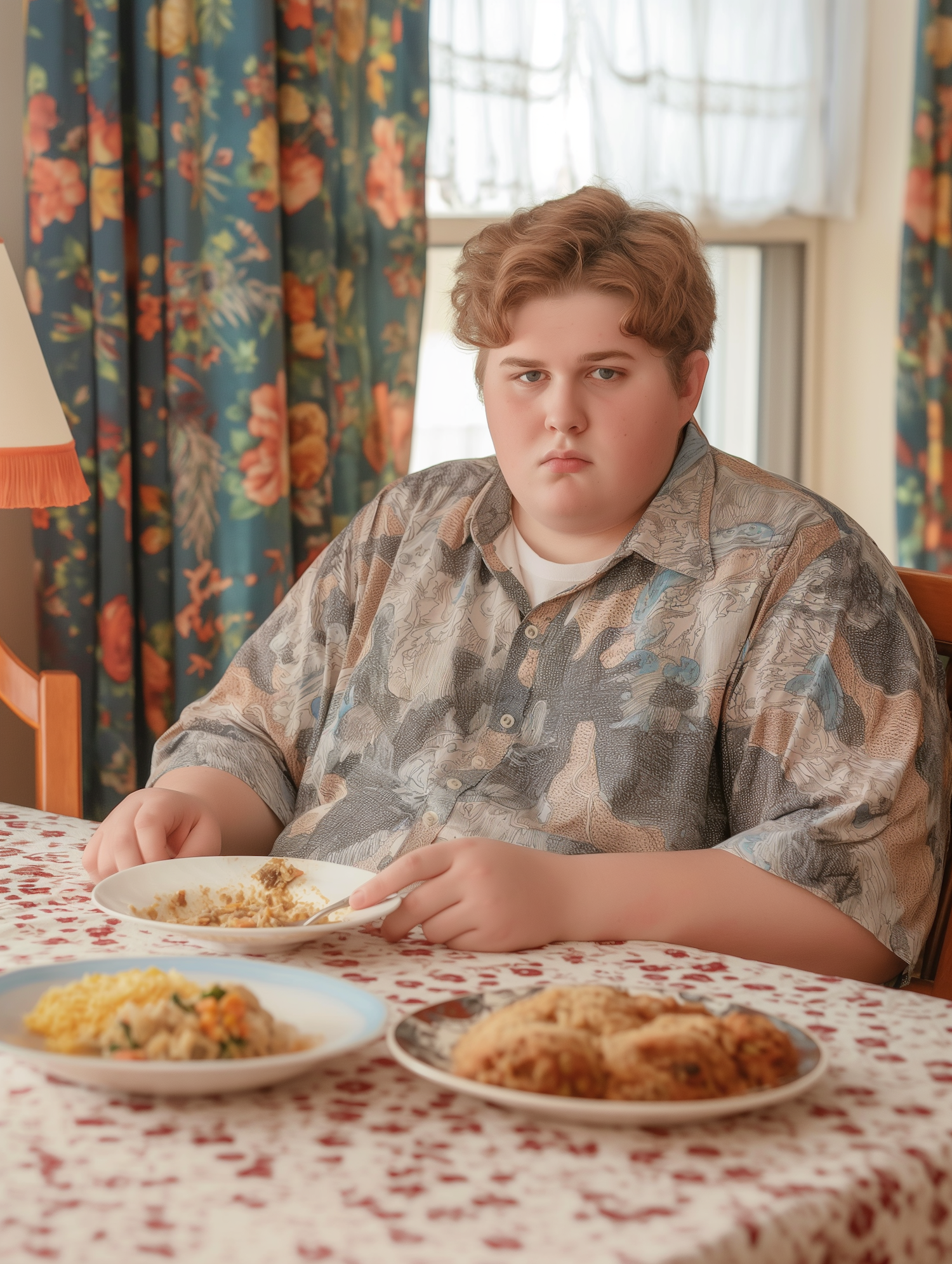 Young man with brown hair at a dining table with plates of food, floral curtains in the background, and a patterned shirt.