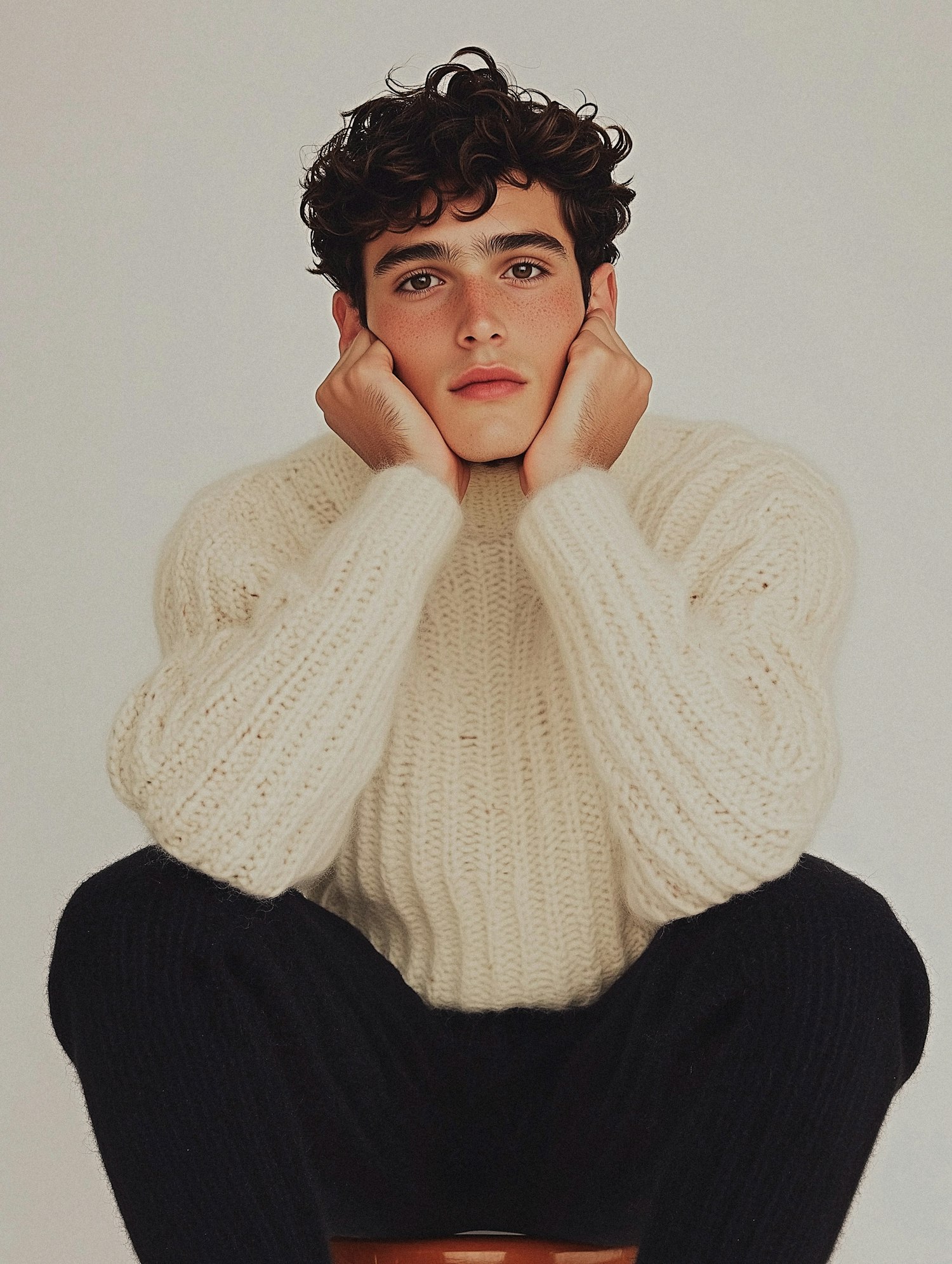 Young man in a cream sweater with curly hair, resting his face in his hands, exuding a contemplative expression.