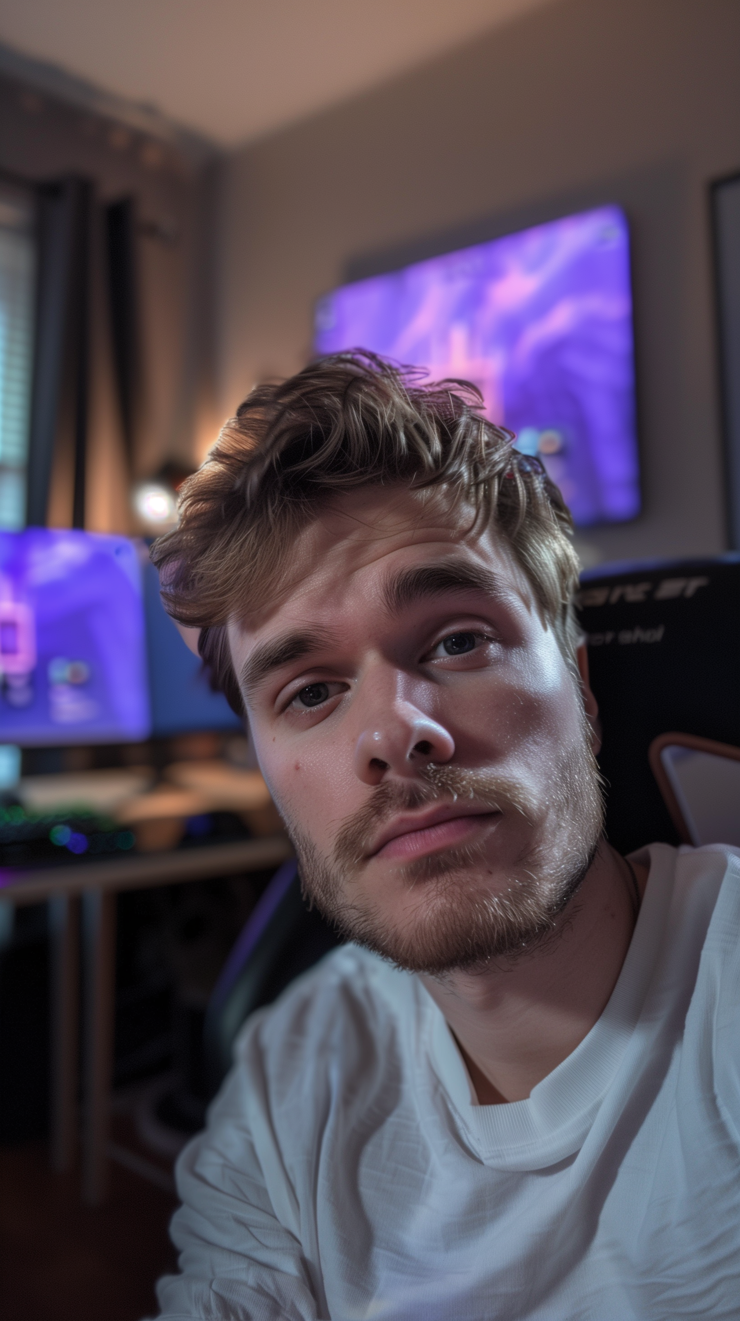 Young man with light brown hair and beard in a gaming setup, wearing a white shirt. Purple screens in the background.