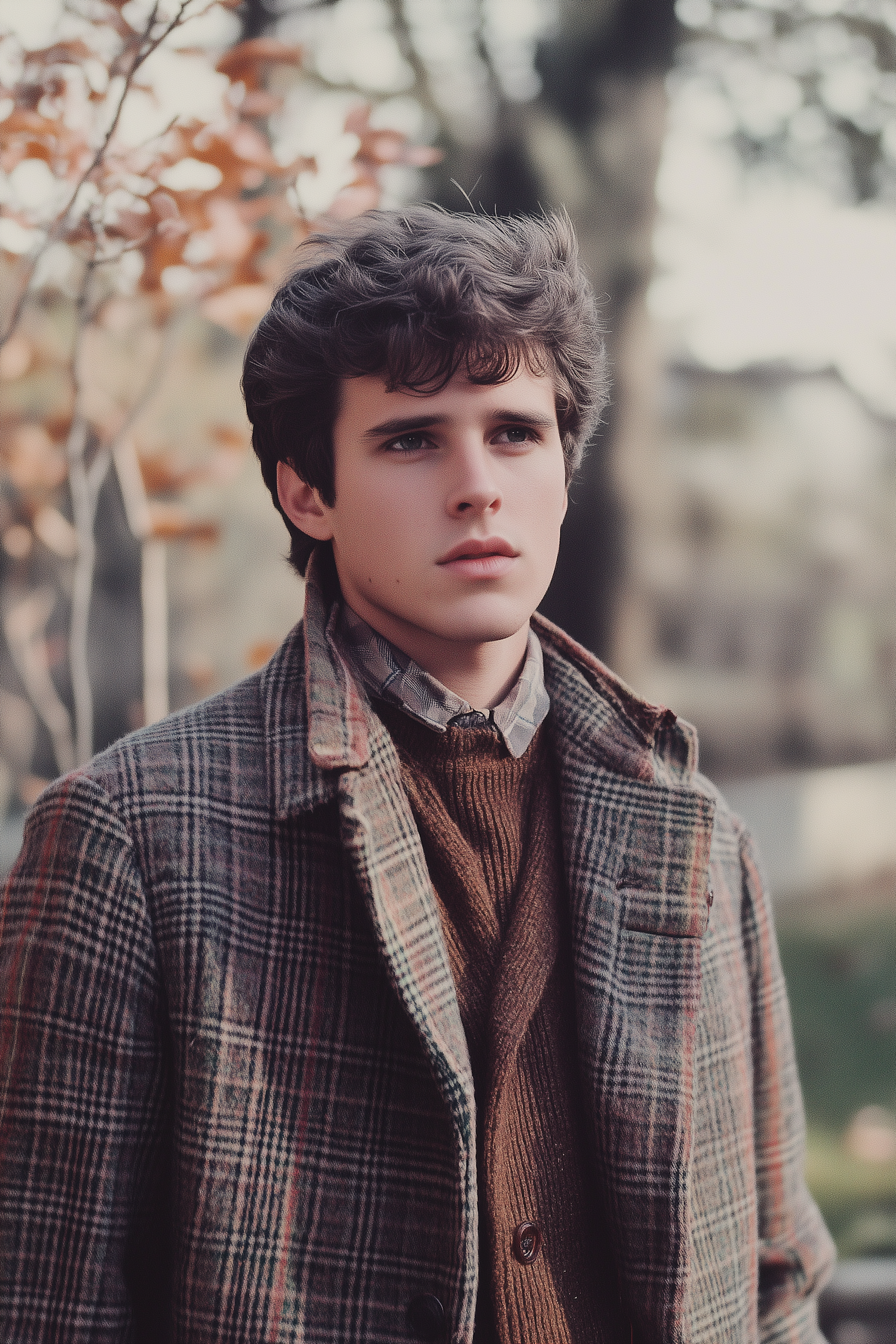 Young man in plaid coat and brown sweater, standing outdoors with autumn foliage. Thoughtful expression, dark hair, fair skin.