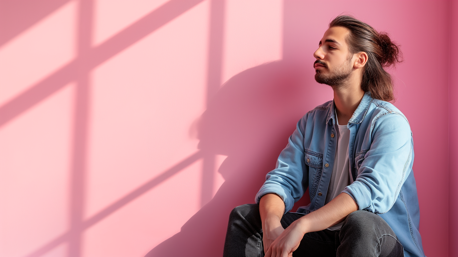 Young man with long hair and denim shirt sits against a pink wall, bathed in sunlight. Contemplative mood with geometric shadows.