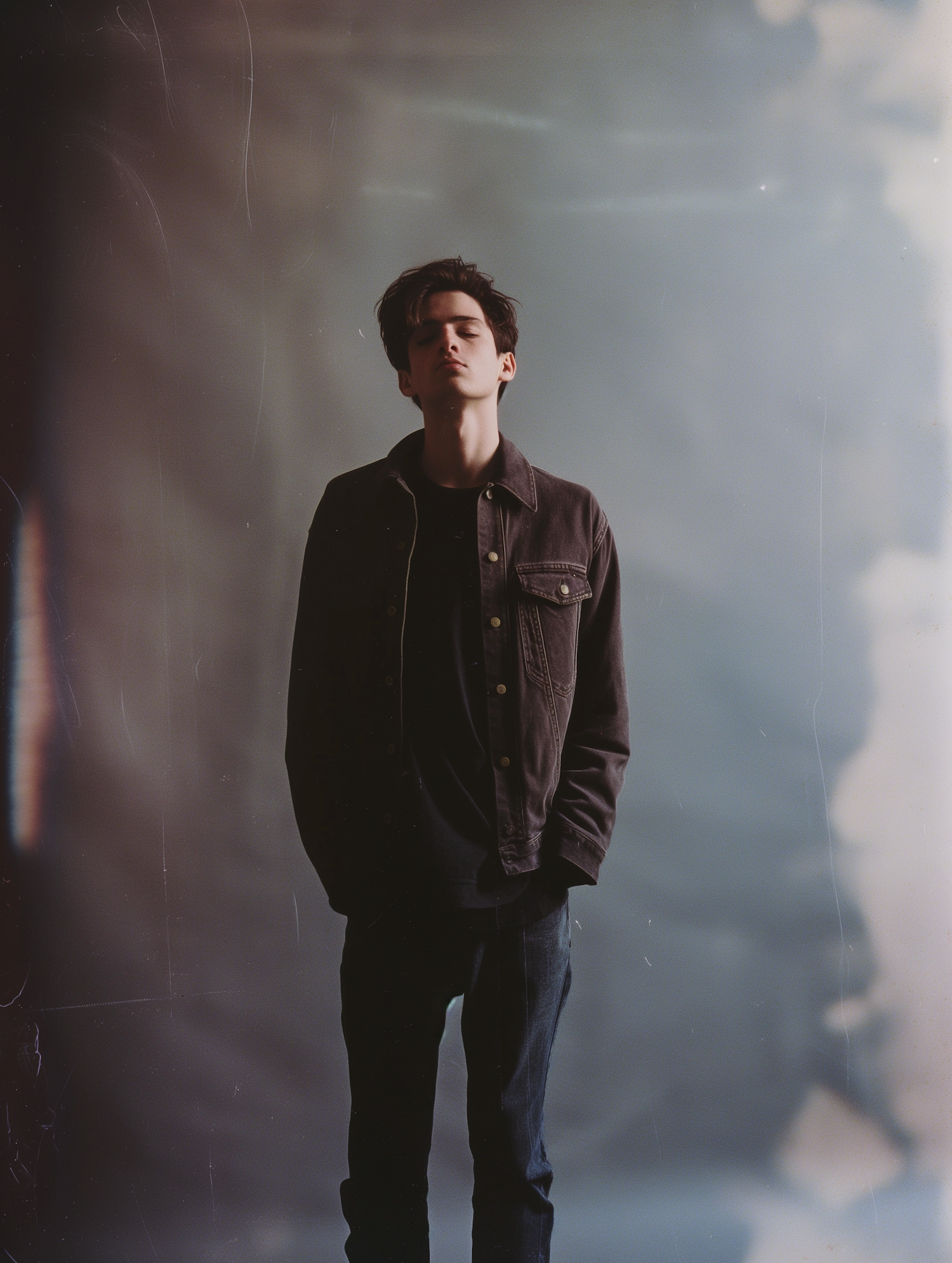 Young man with dark hair and closed eyes in a dark jacket, set against a soft blue-gray background, exuding calmness.
