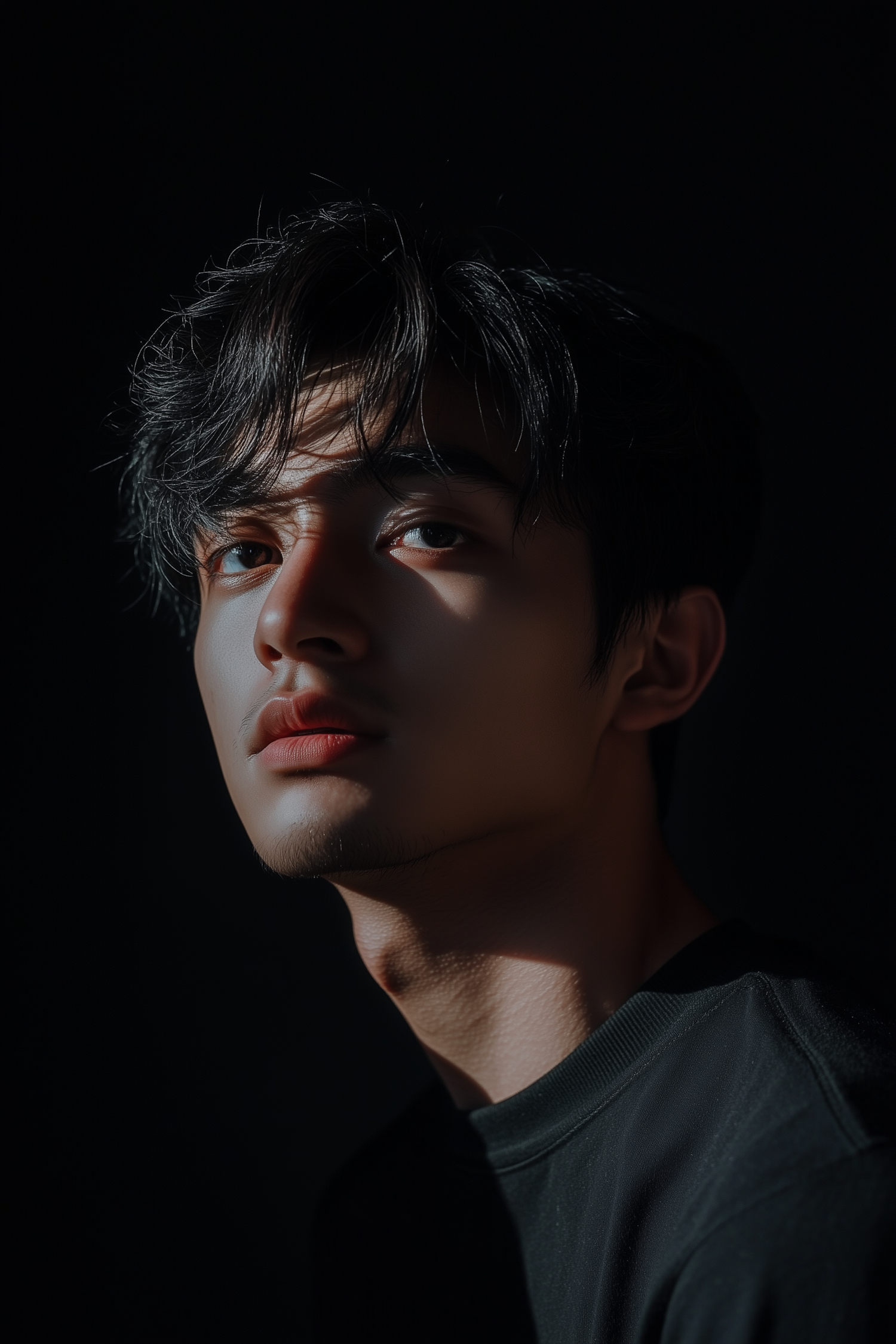 Dramatic portrait of a young man with dark hair and expressive eyes, highlighted by artistic lighting and shadows.