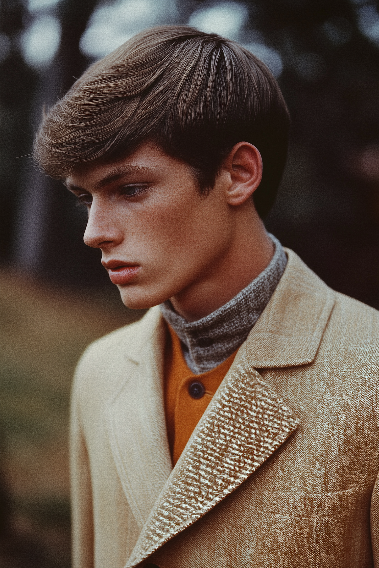 Young man in beige coat and mustard shirt, with light brown hair, gazing thoughtfully outdoors.