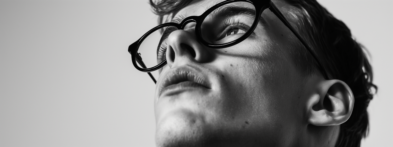 Black and white close-up of a young man with glasses looking upwards, highlighting facial features and expression.