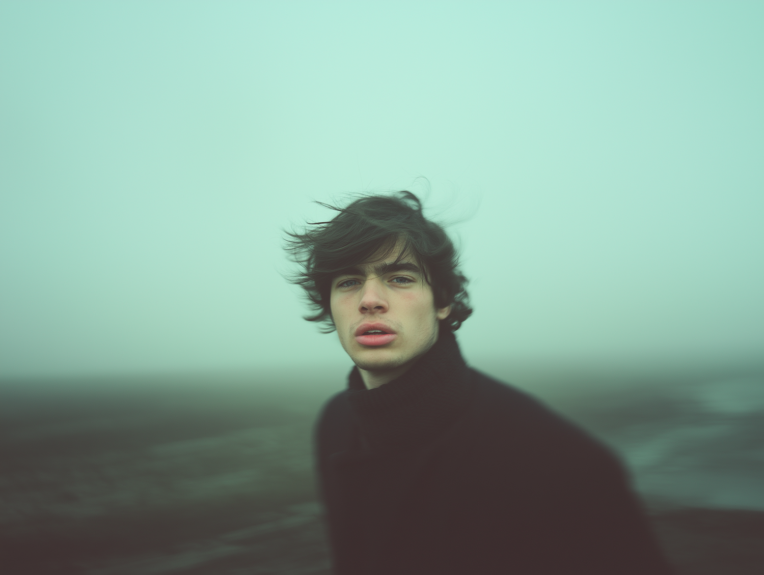 Moody portrait of a young man with tousled hair in a misty, green-hued landscape, evoking introspection and solitude.