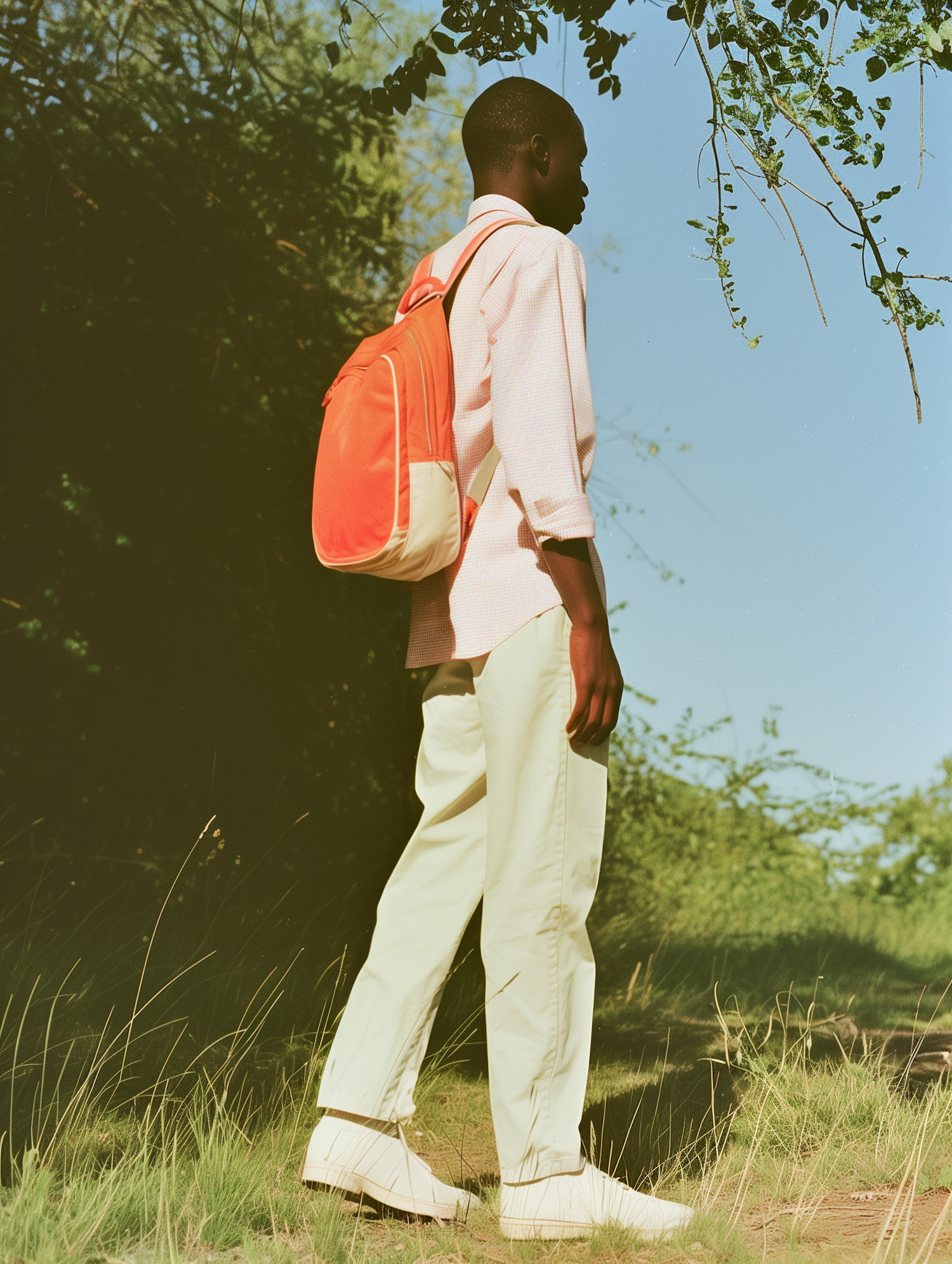 Young man with orange backpack in a sunlit, green outdoor setting, wearing a pink shirt and cream pants, gazing into the distance.