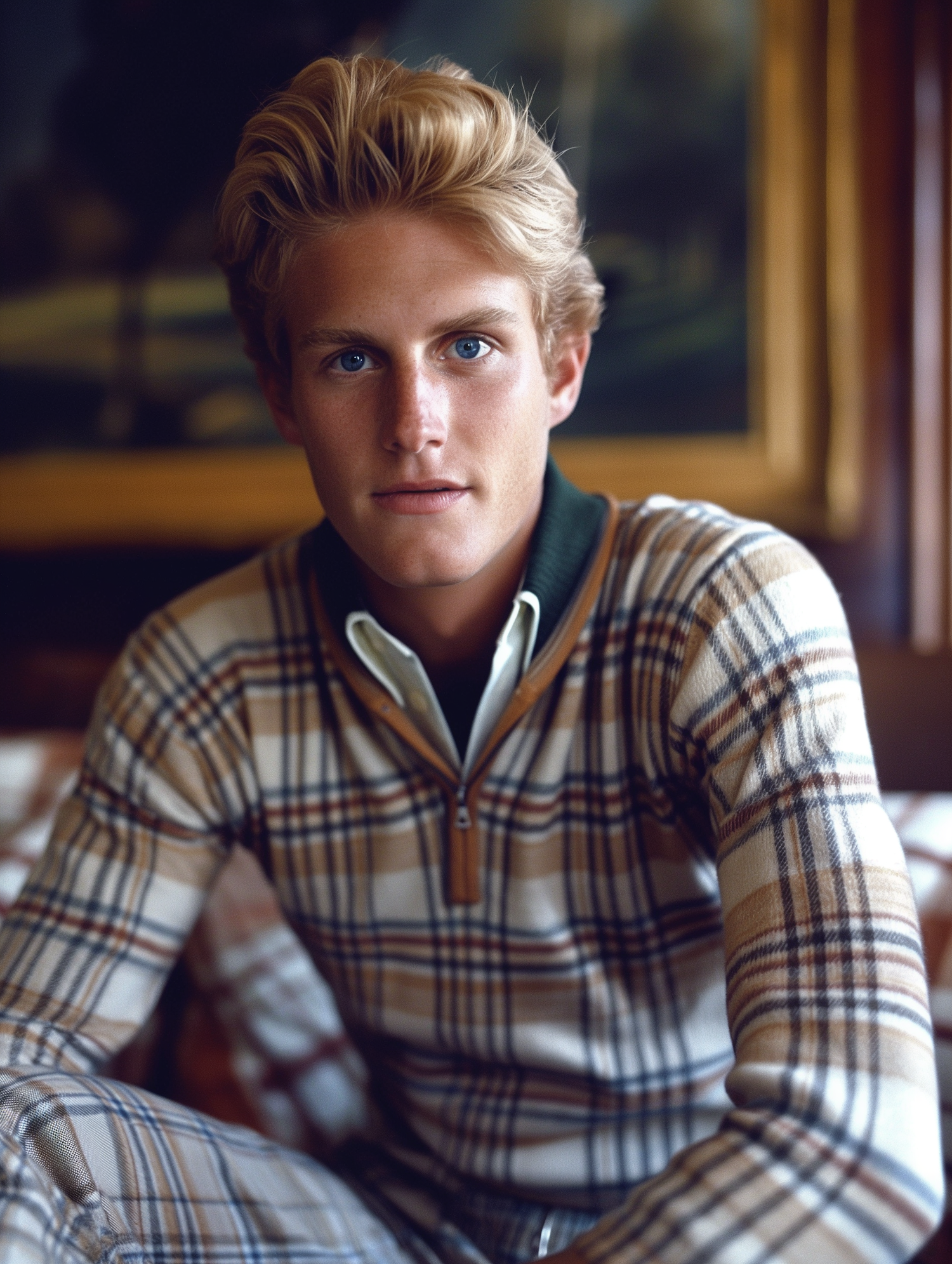 Young man with blonde hair and blue eyes in a plaid sweater, sitting indoors with a calm expression.