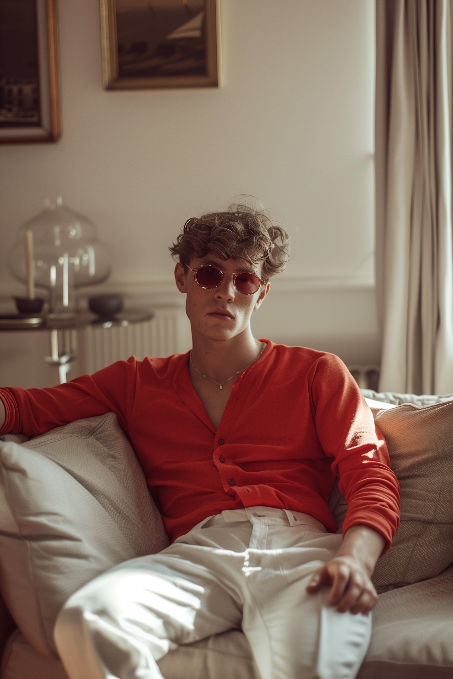 Stylish young man in red shirt and sunglasses relaxing on a sofa in a softly lit room, exuding a laid-back and fashionable vibe.