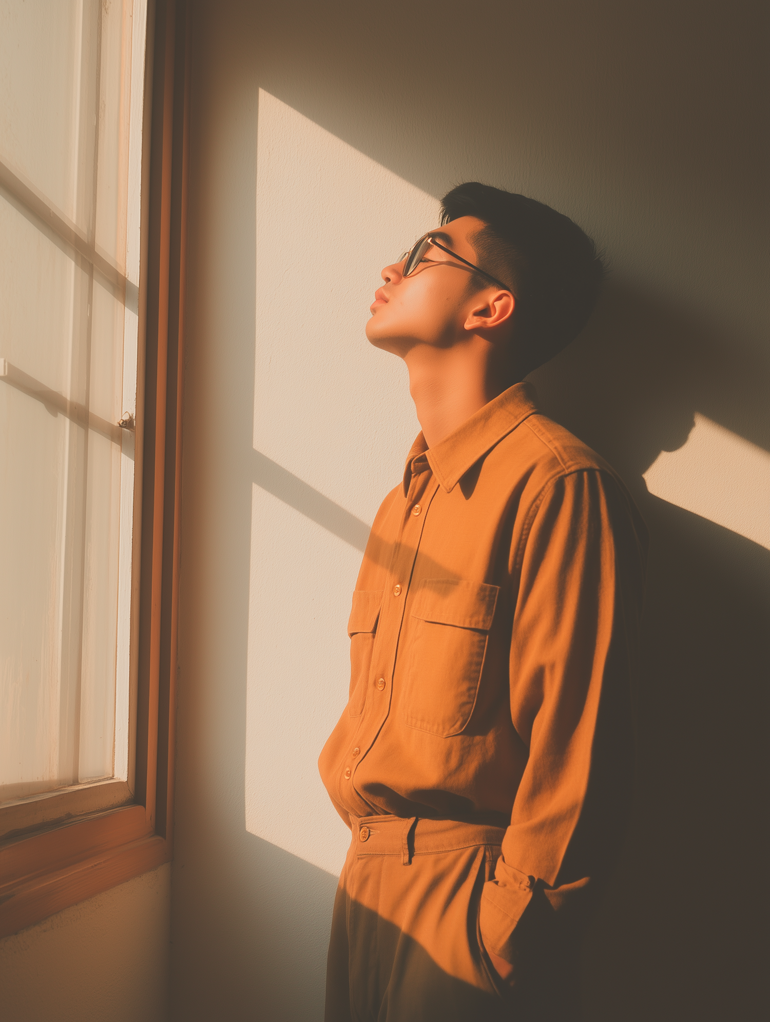 Asian man in brown outfit gazes out window, bathed in warm sunlight, creating a serene and contemplative atmosphere.