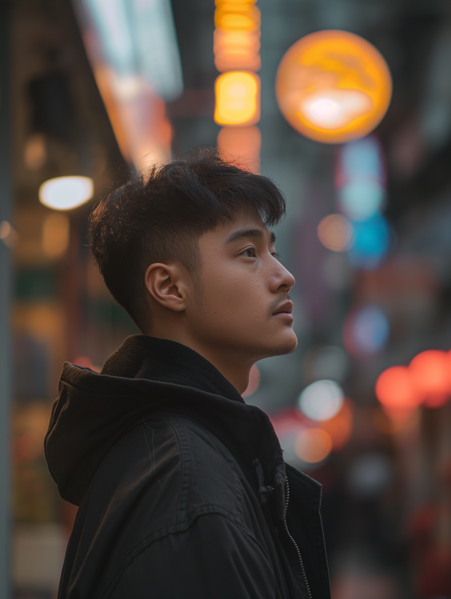 Asian man in dark jacket gazes thoughtfully in a vibrant city night scene with colorful bokeh lights.