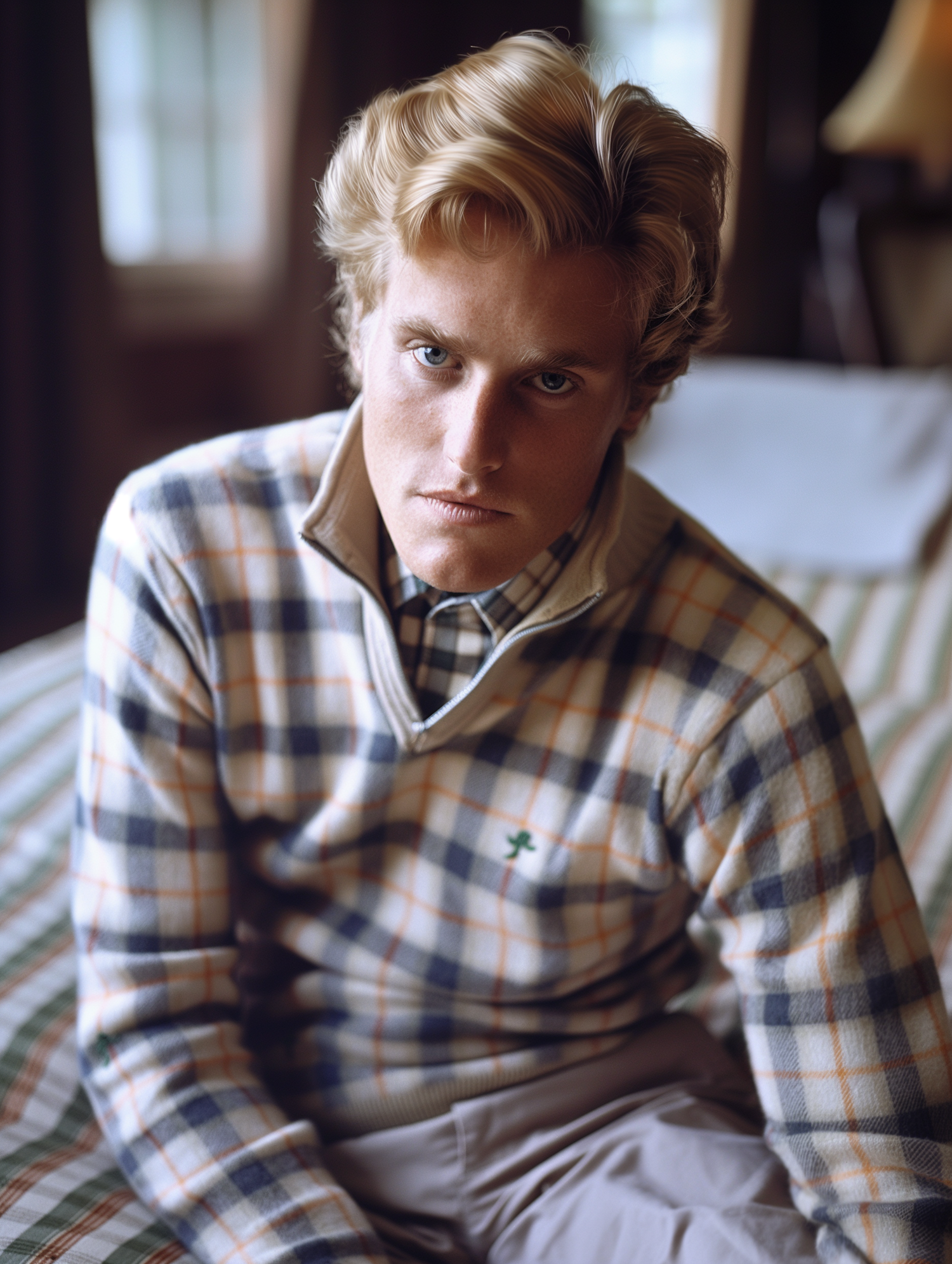 Young man with blonde hair in plaid sweater, sitting on a bed with a serious expression. Warm indoor setting.