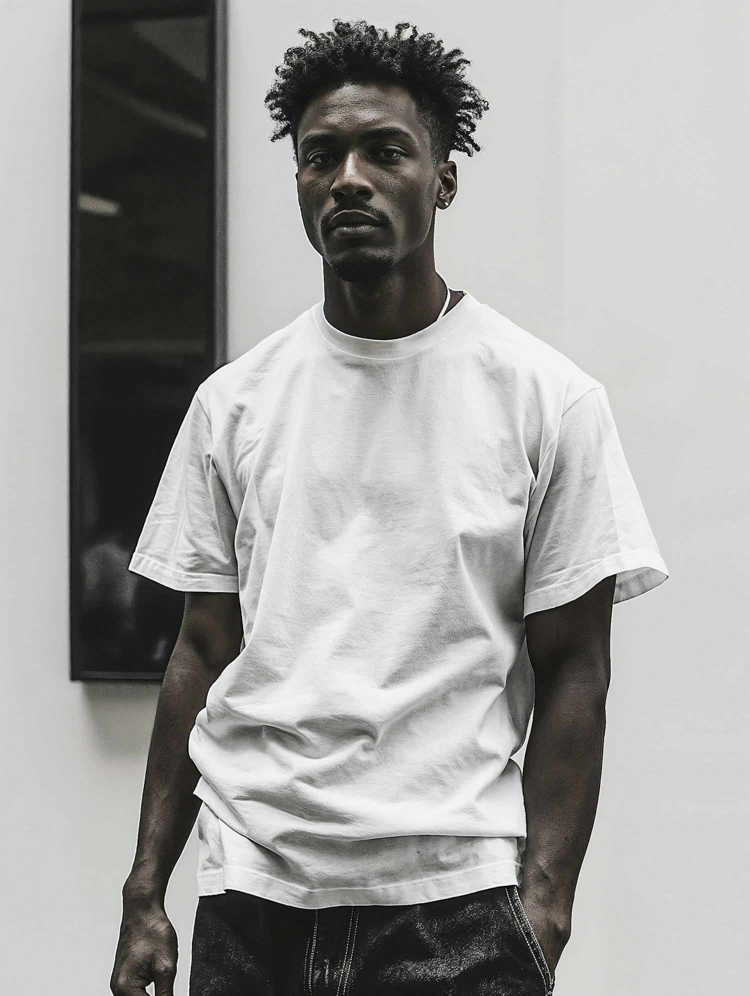 Confident man in a white t-shirt and jeans, standing against a minimalist background with soft lighting.