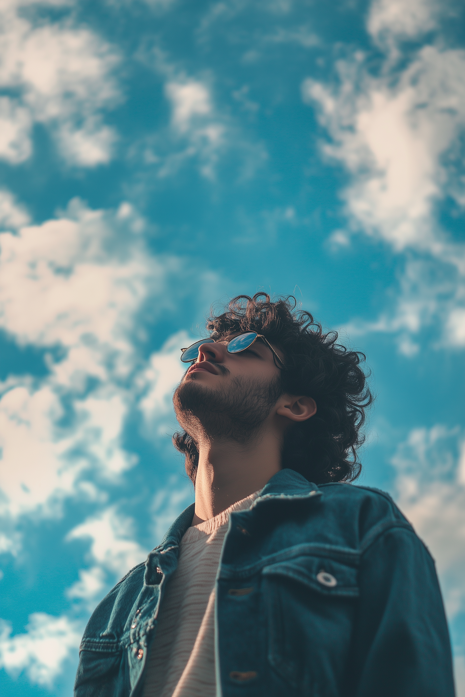 Young man in denim jacket gazes at the sky, wearing sunglasses. Bright blue sky with clouds in the background.
