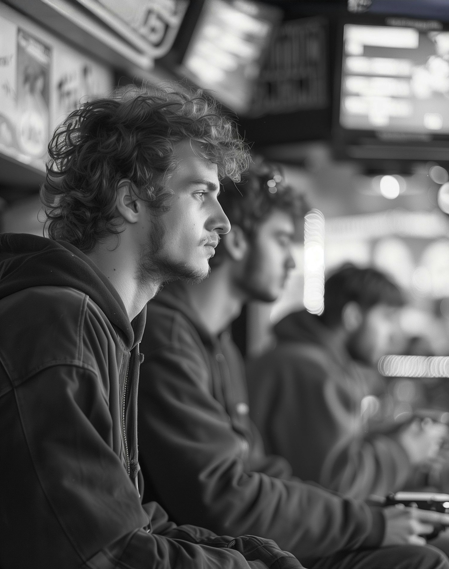 Black and white photo of young men in hoodies focused on screens, possibly in a gaming or arcade setting.