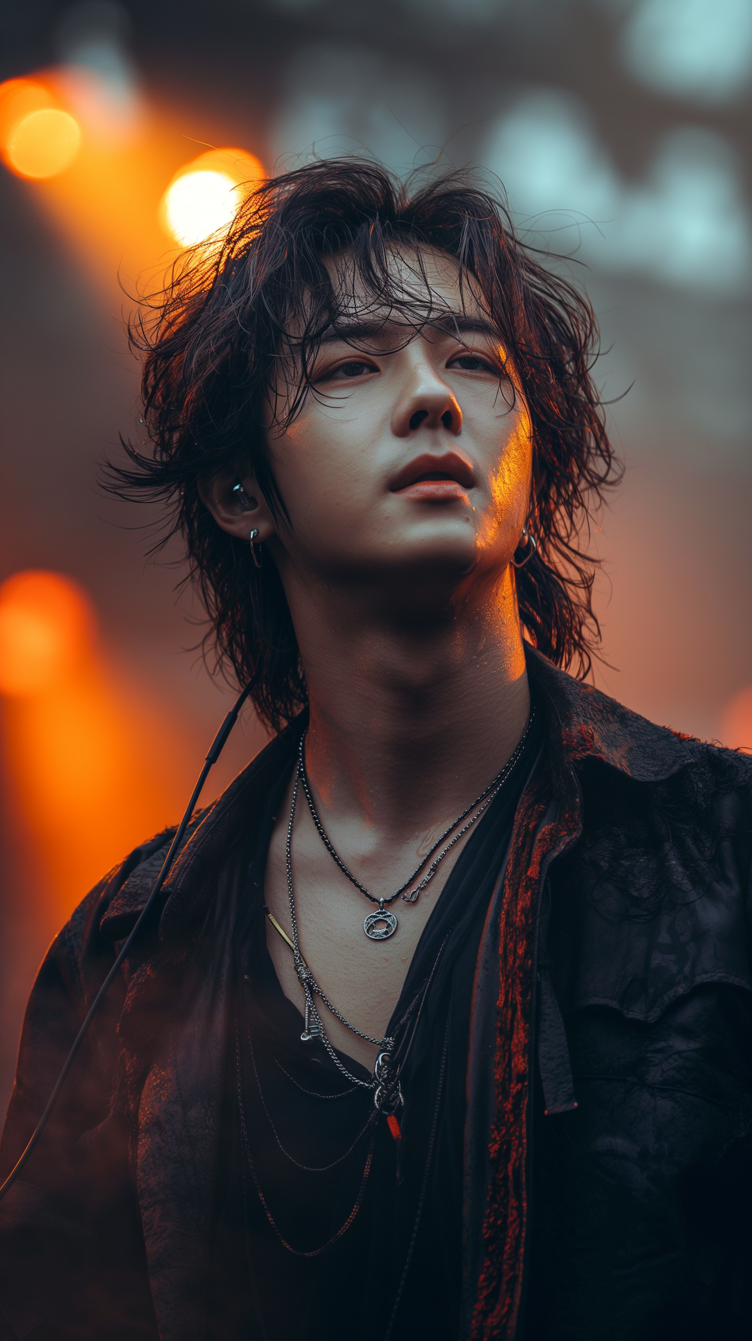 Asian male with dark hair and layered necklaces in dramatic orange lighting, suggesting a concert or artistic setting.