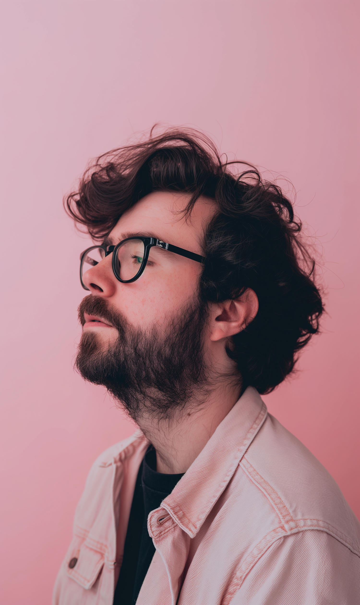 Caucasian man with curly hair and glasses in a pink jacket against a pink background, looking thoughtful.