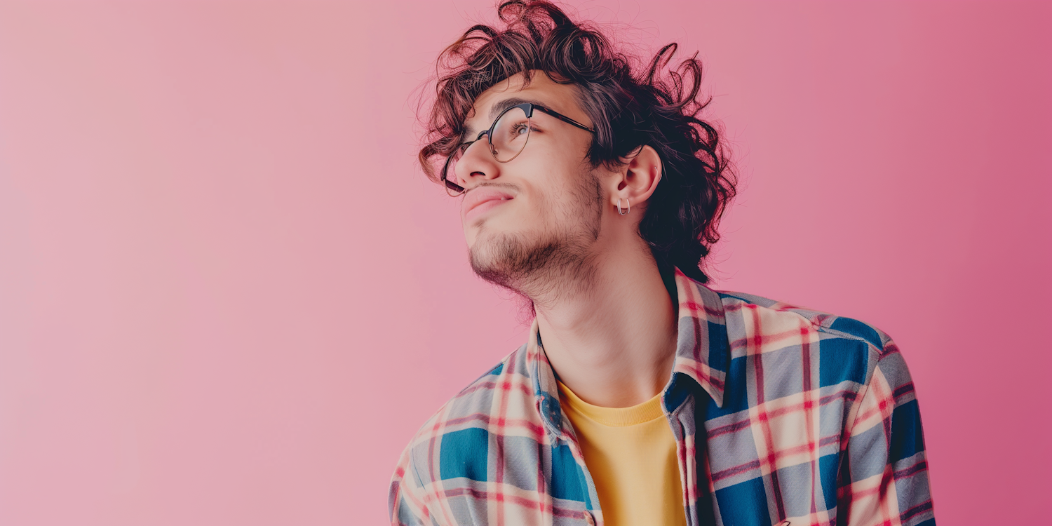 Young man with curly hair and glasses in plaid shirt against a pink background, looking upward thoughtfully.
