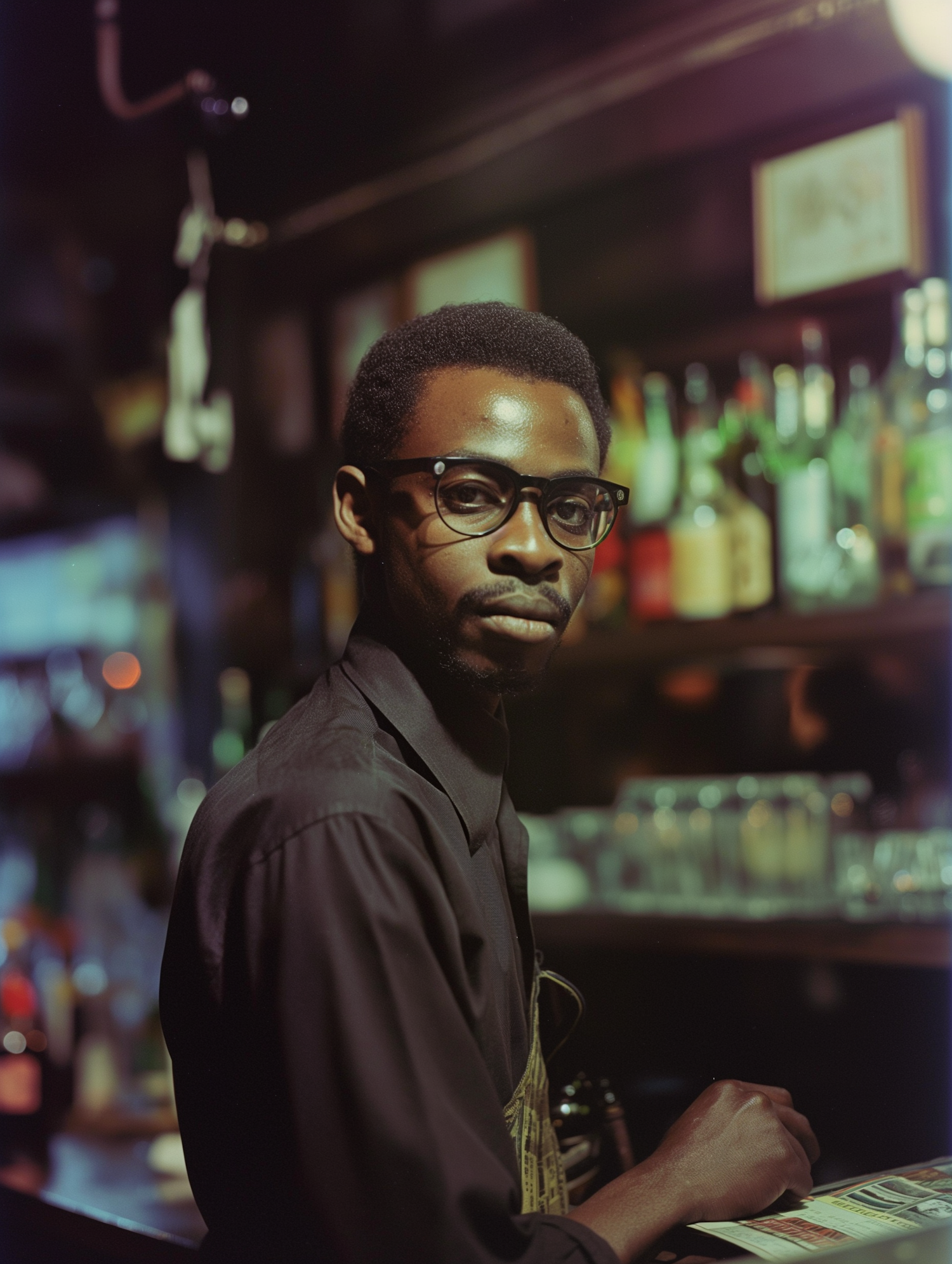 A man in glasses stands in a dimly lit bar, holding a menu. The background features a colorful array of bottles.
