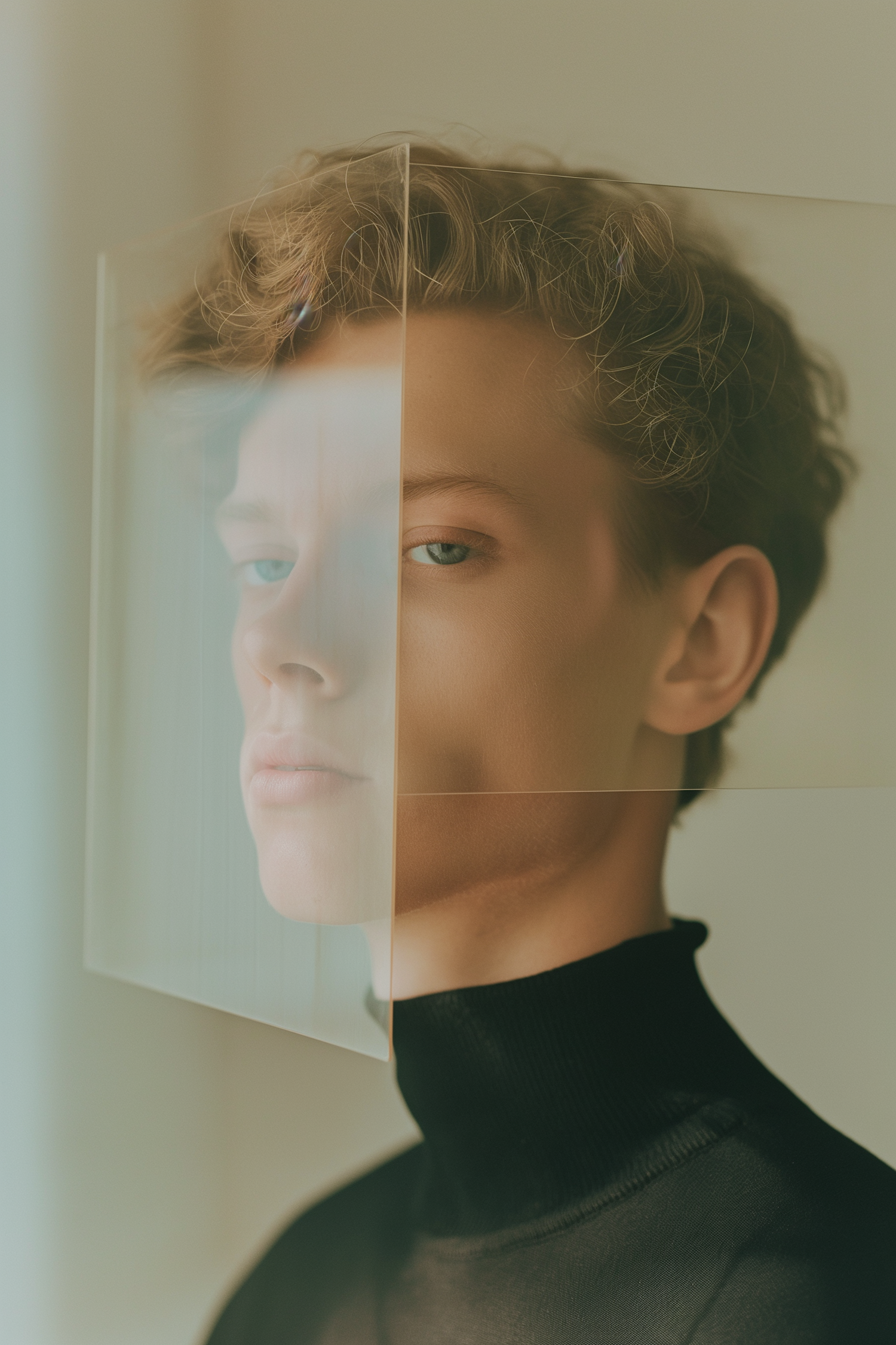 Artistic portrait of a young man with curly hair, partially obscured by glass, creating a distorted reflection. Soft lighting and neutral tones.