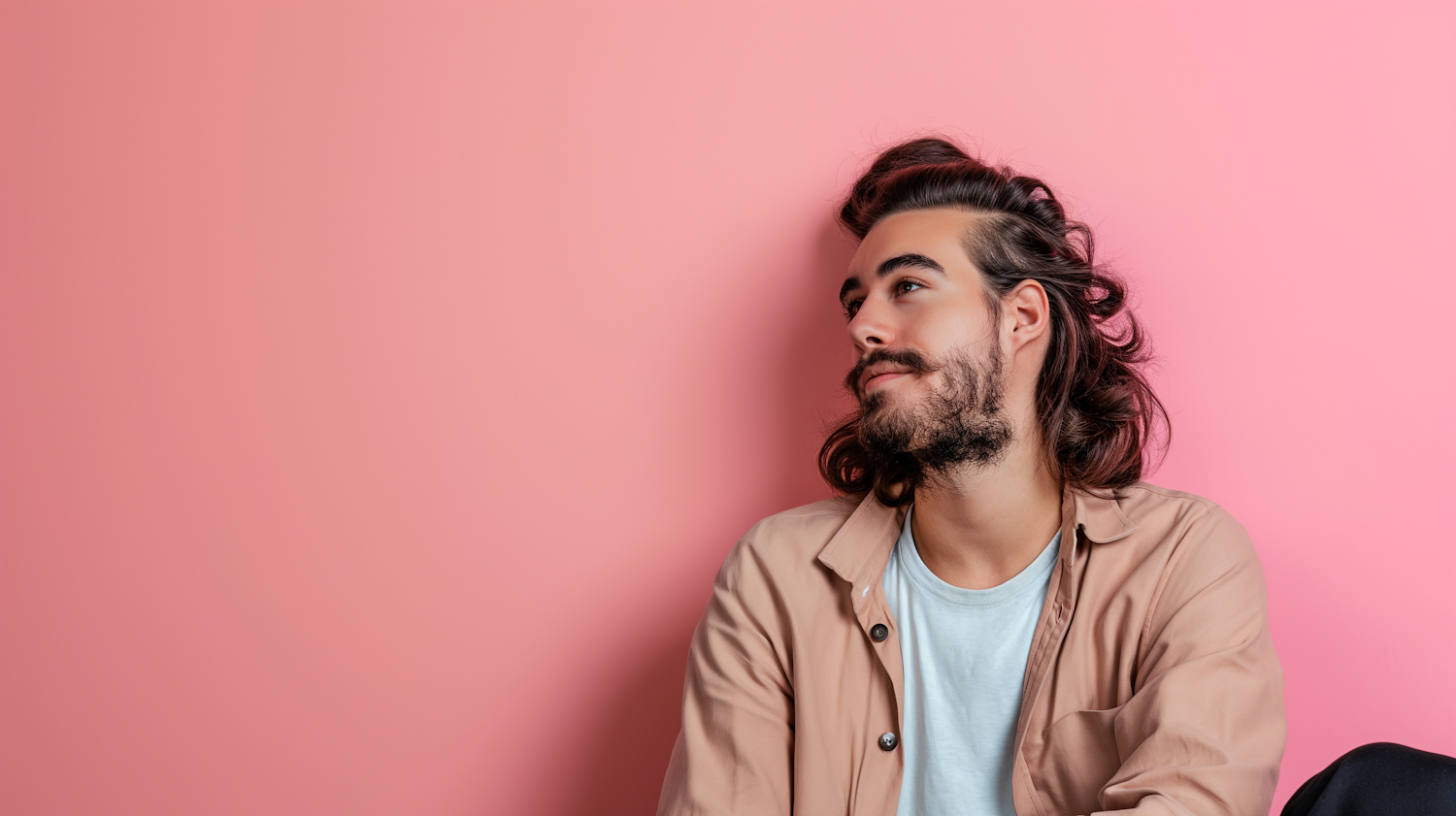 Young man with long brown hair and beard, wearing a brown shirt, gazes thoughtfully against a pink background.