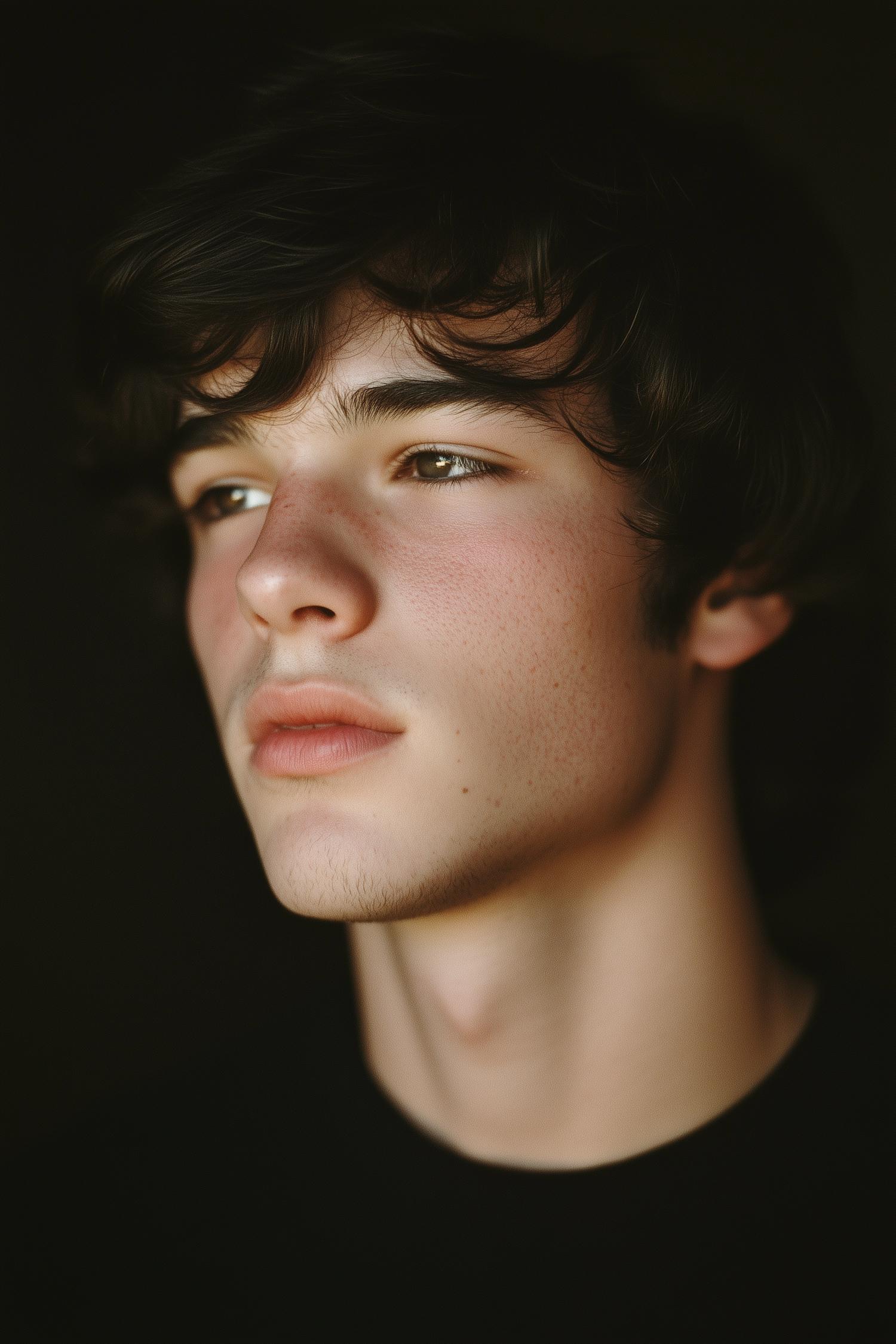 Portrait of a young man with dark hair and light brown eyes, gazing thoughtfully. Dark background enhances his contemplative expression.