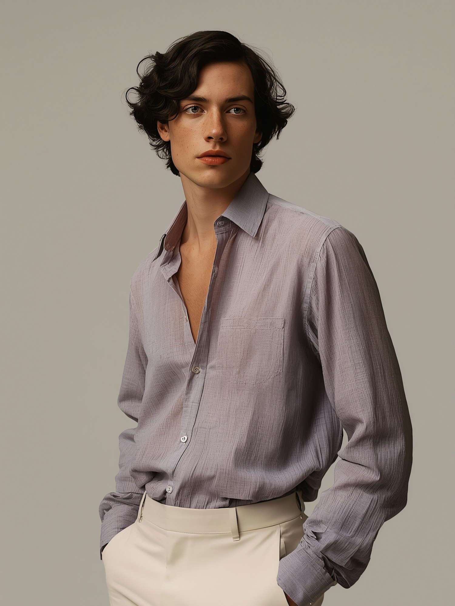 Stylish young man in a lavender shirt and cream trousers, exuding a modern and elegant vibe against a neutral background.