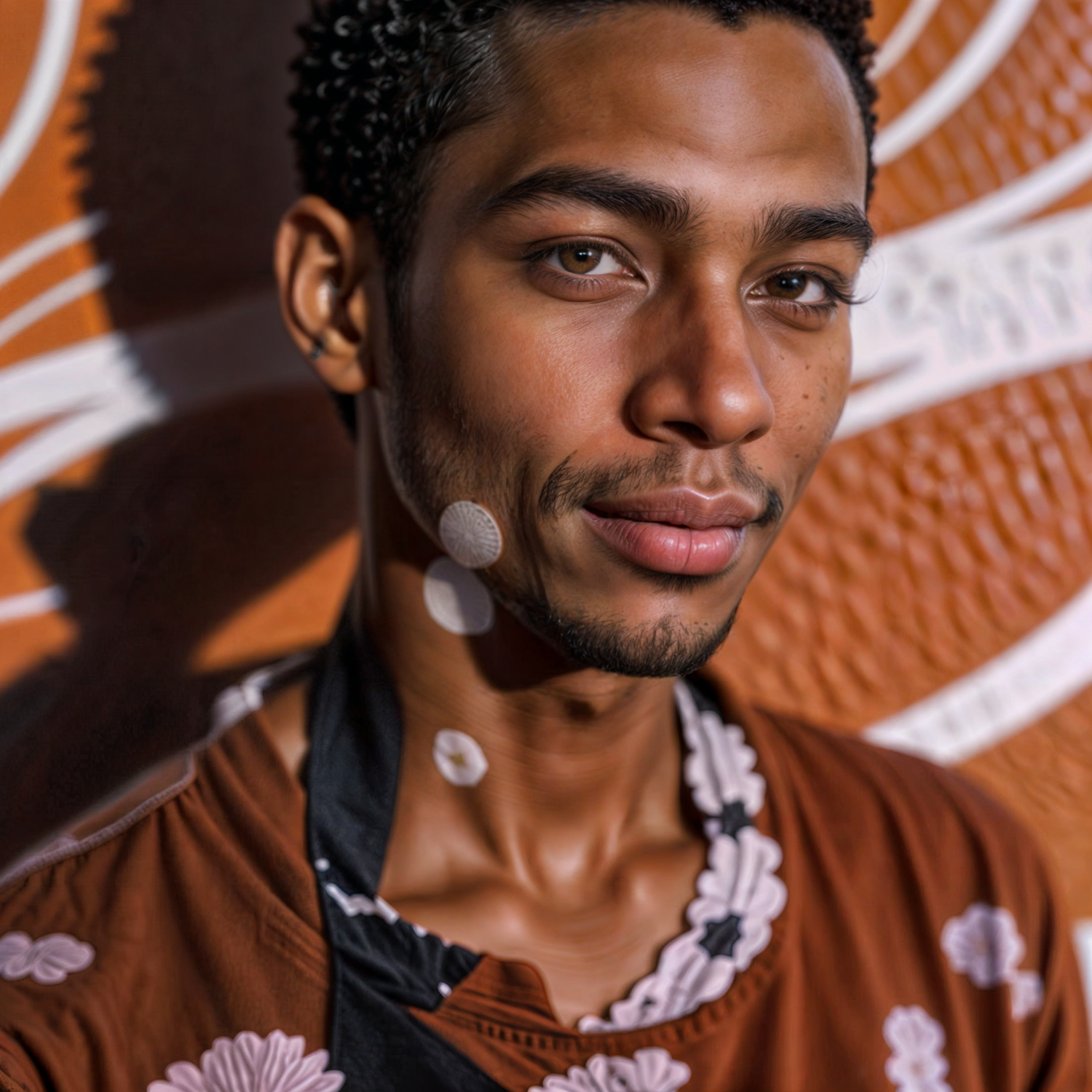 Close-up portrait of a young man with curly hair and a floral shirt against an abstract orange background.