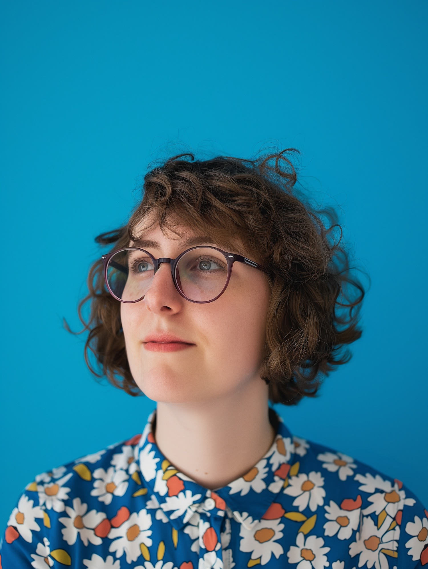 Young woman with curly hair and glasses in a floral shirt against a bright blue background, looking thoughtfully upward.