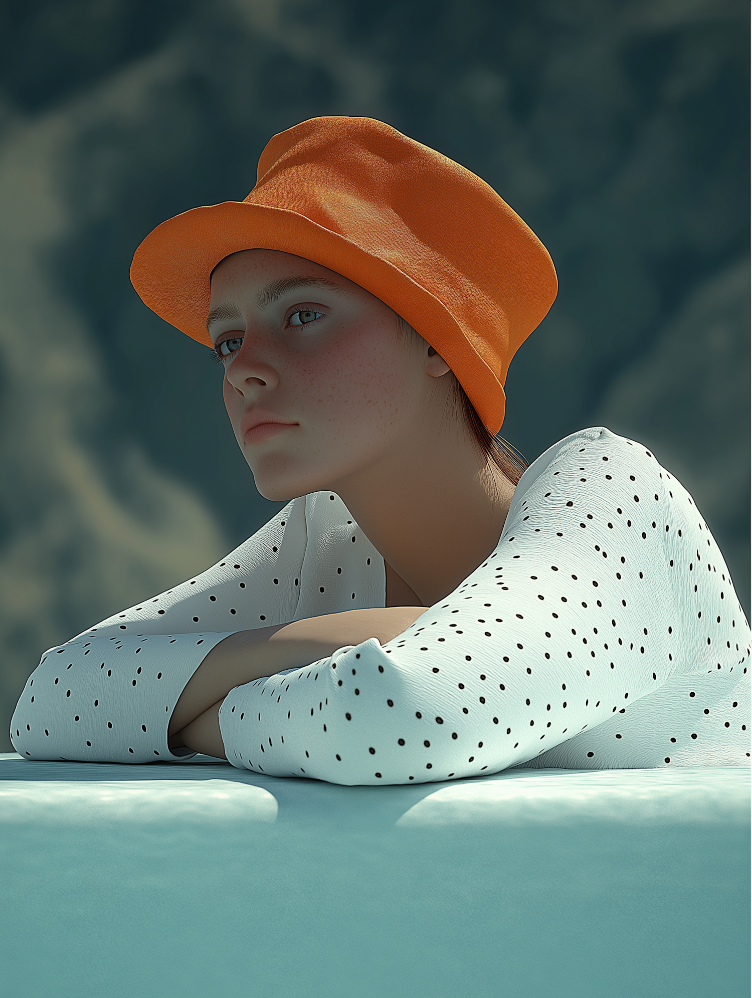 A contemplative person in an orange hat and polka dot shirt gazes into the distance, set against a blurred natural background.