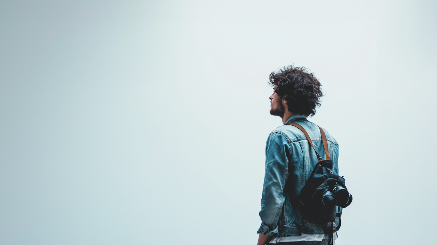 Young man with curly hair in denim jacket, carrying a camera, gazes upward against a minimalist light blue background.