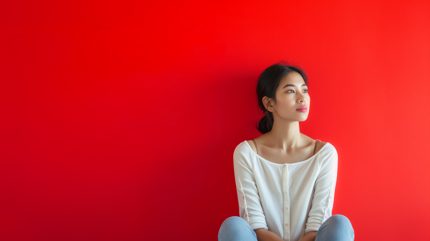 Asian woman in white top and jeans sits against a vibrant red background, gazing thoughtfully into the distance.