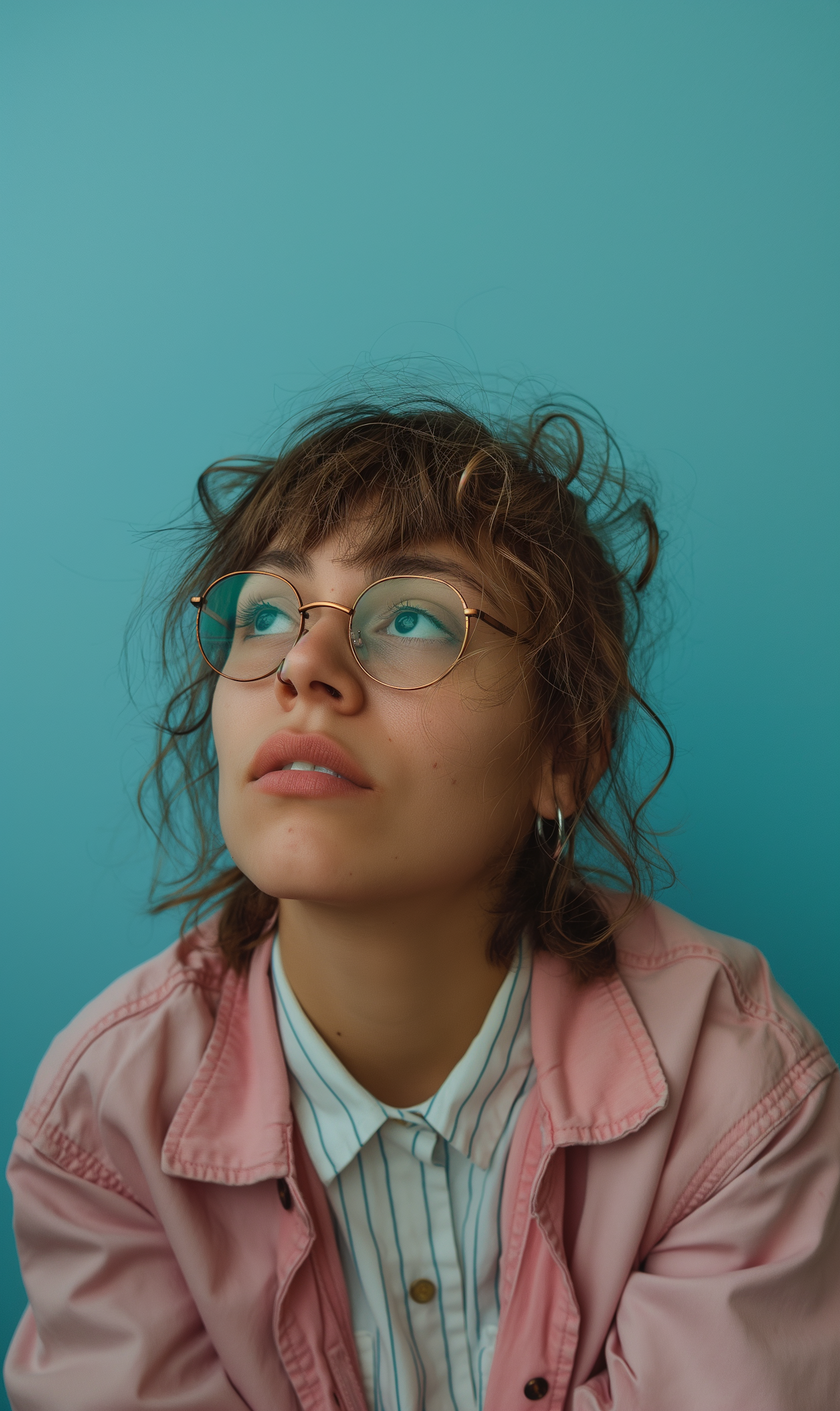 Young woman with glasses in a pink jacket gazes thoughtfully against a teal background, exuding a modern and relaxed vibe.