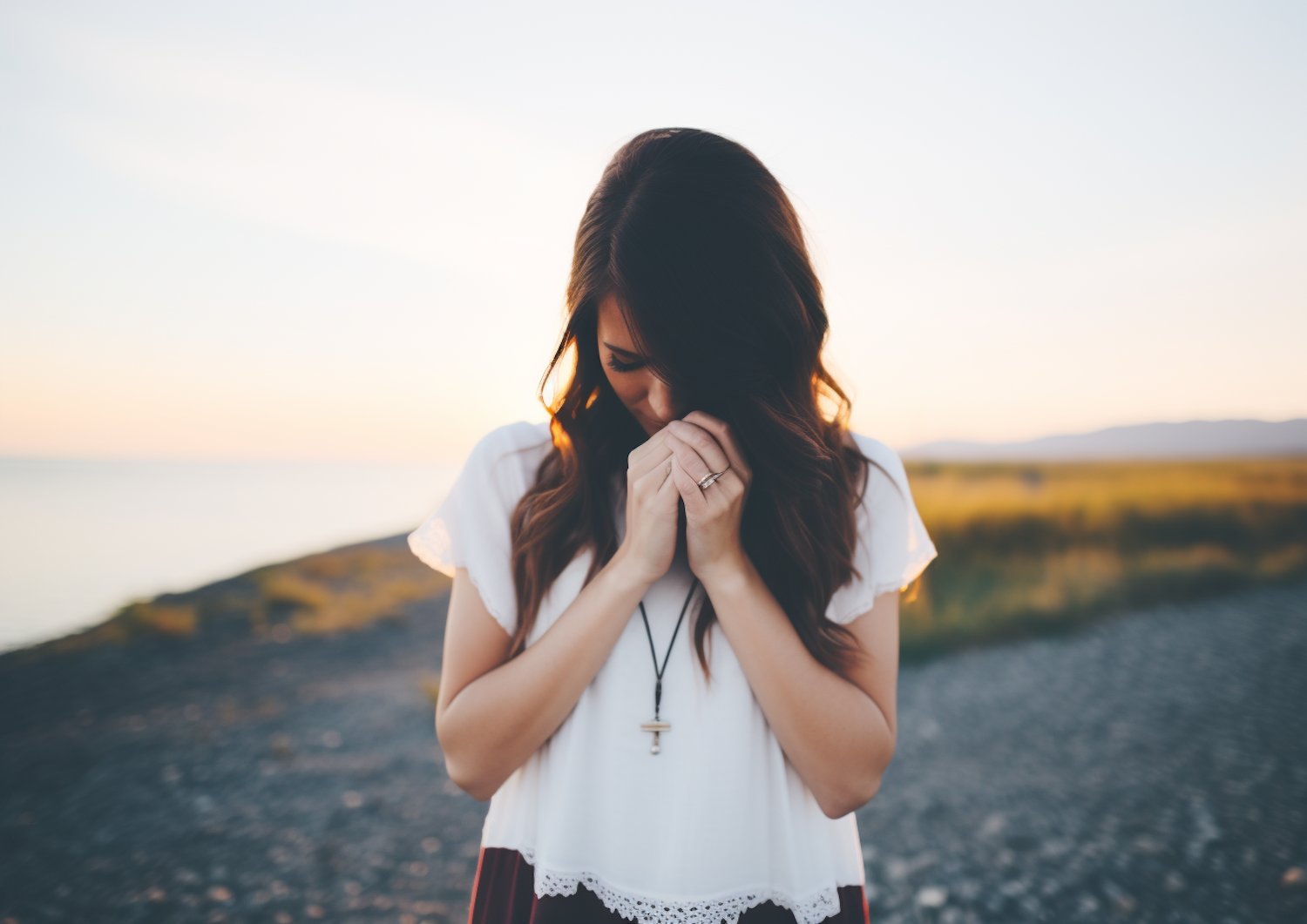 Young woman in white blouse with cross necklace, standing contemplatively by a serene lakeside at sunset.