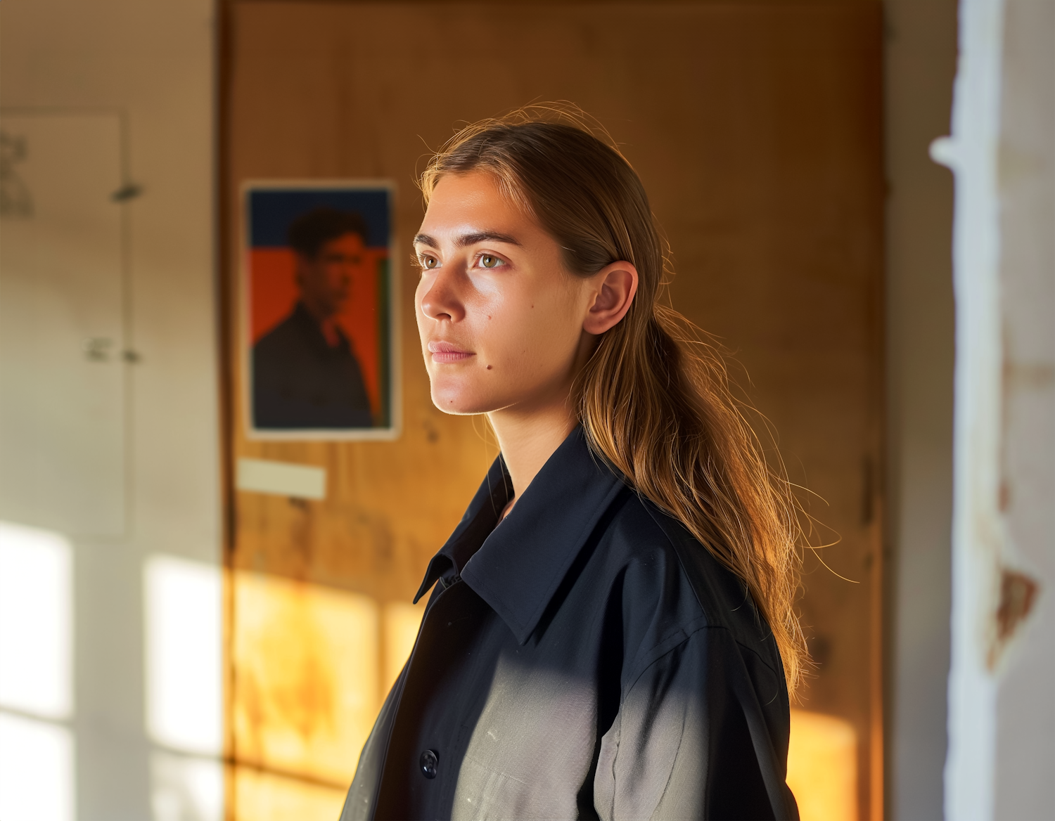 Young woman in a dark coat gazes thoughtfully in a sunlit room with a blurred portrait in the background.
