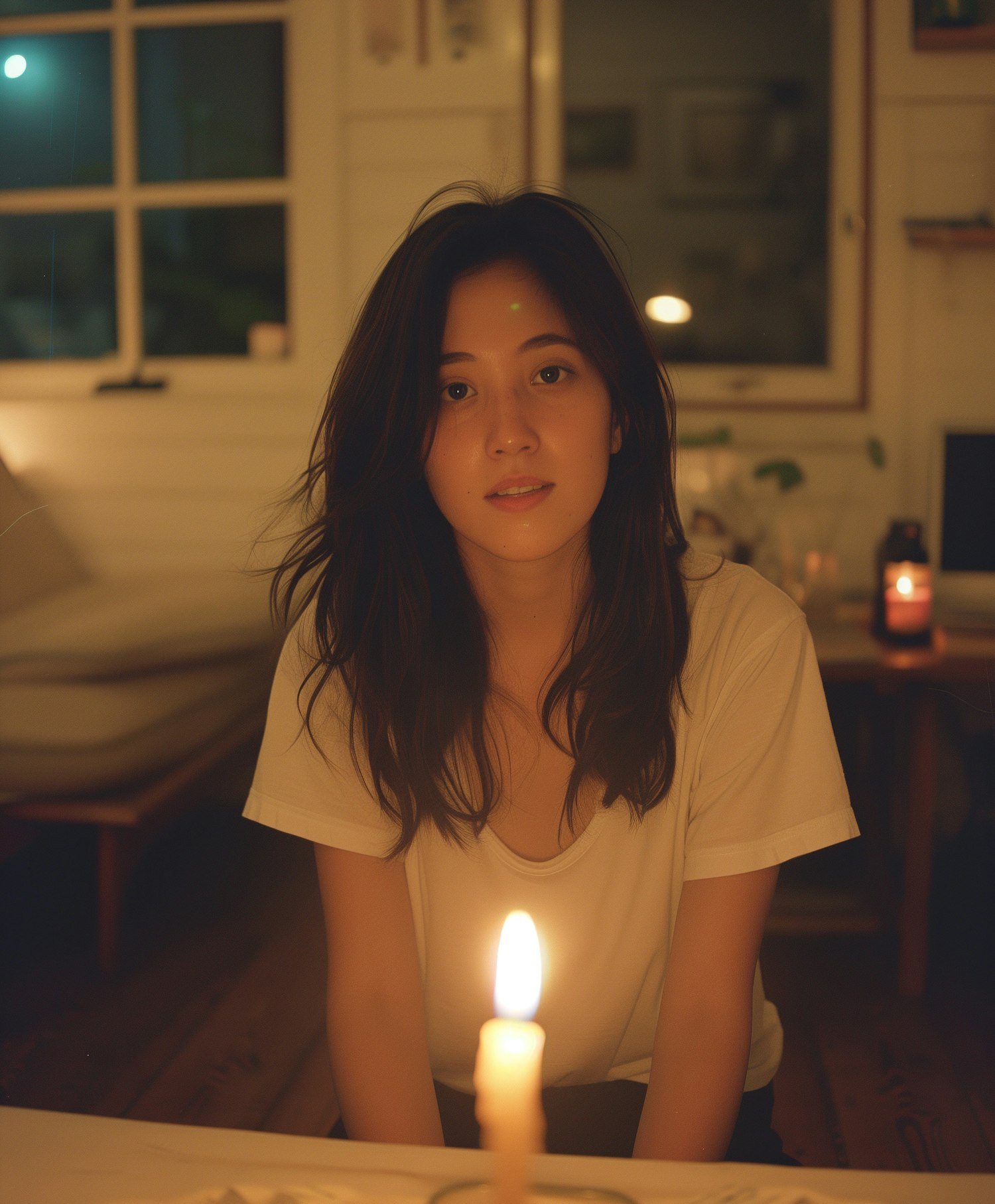 Young woman in a cozy room, illuminated by candlelight, creating a warm and intimate atmosphere.