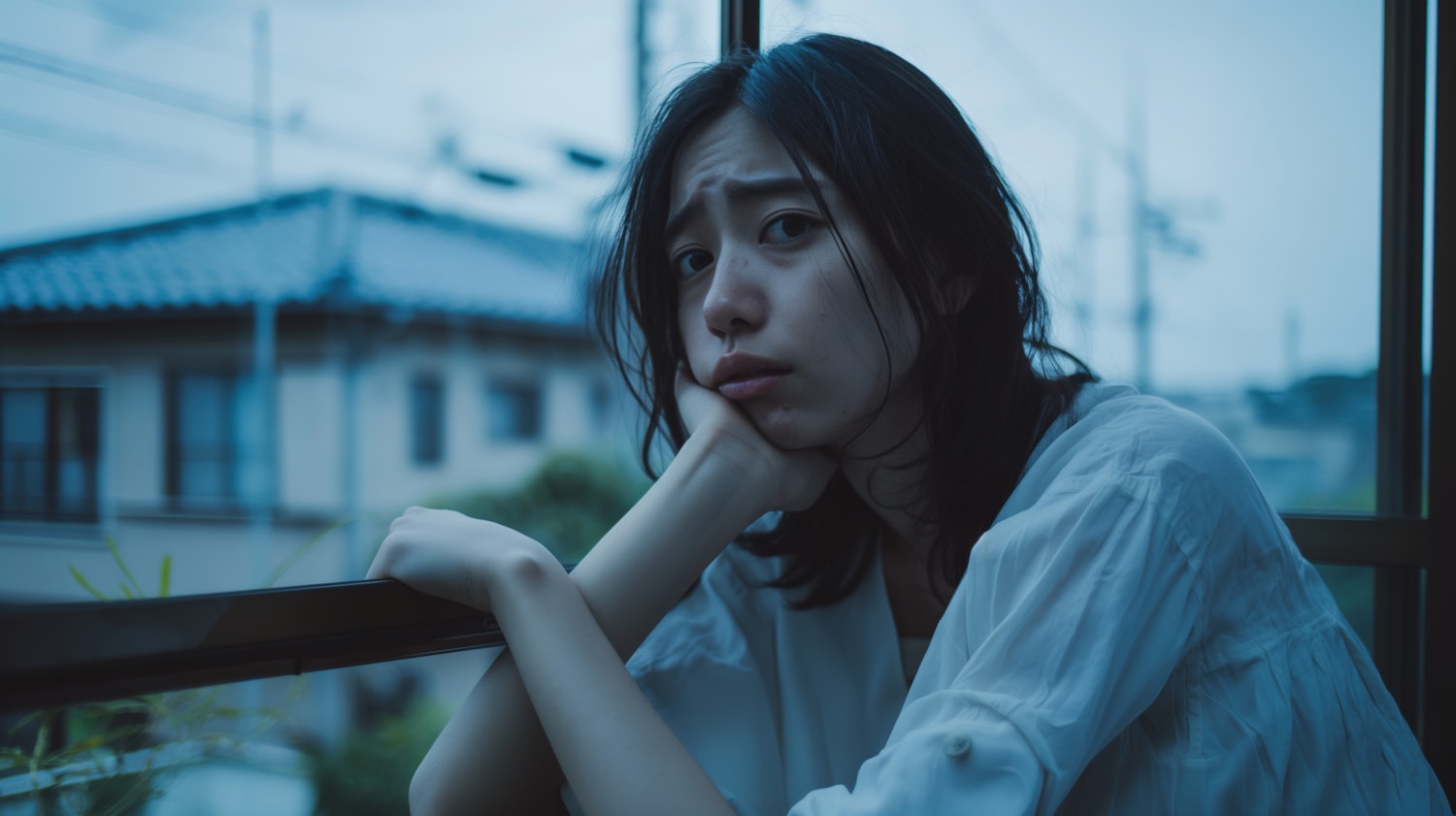 A contemplative young woman gazes out a window, her expression thoughtful and melancholic, set against a blurred residential backdrop.