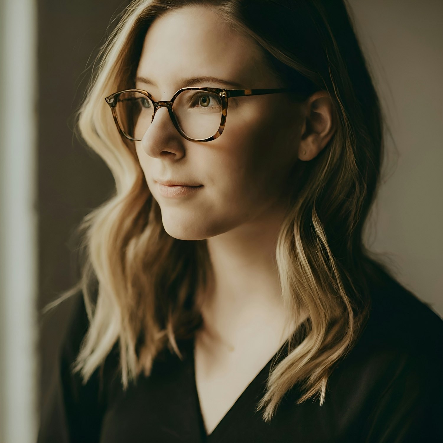 Thoughtful young woman with tortoiseshell glasses and wavy light brown hair, softly lit against a neutral background.