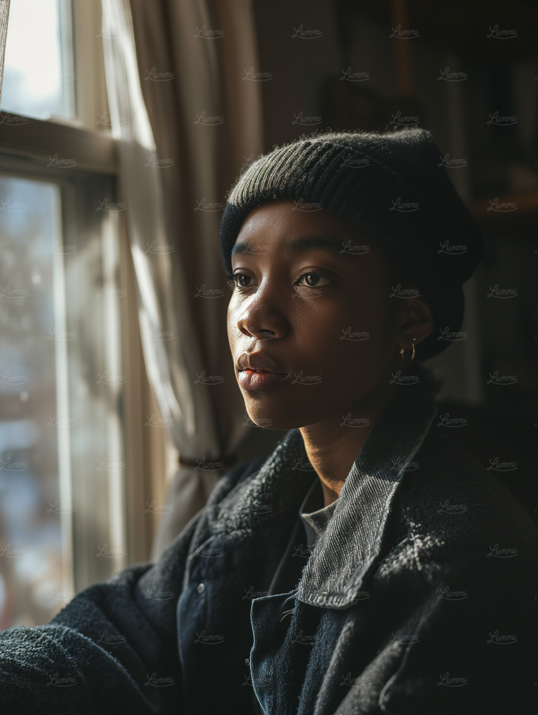 A young woman in a beanie gazes thoughtfully out a window, bathed in soft light, creating a serene and contemplative mood.
