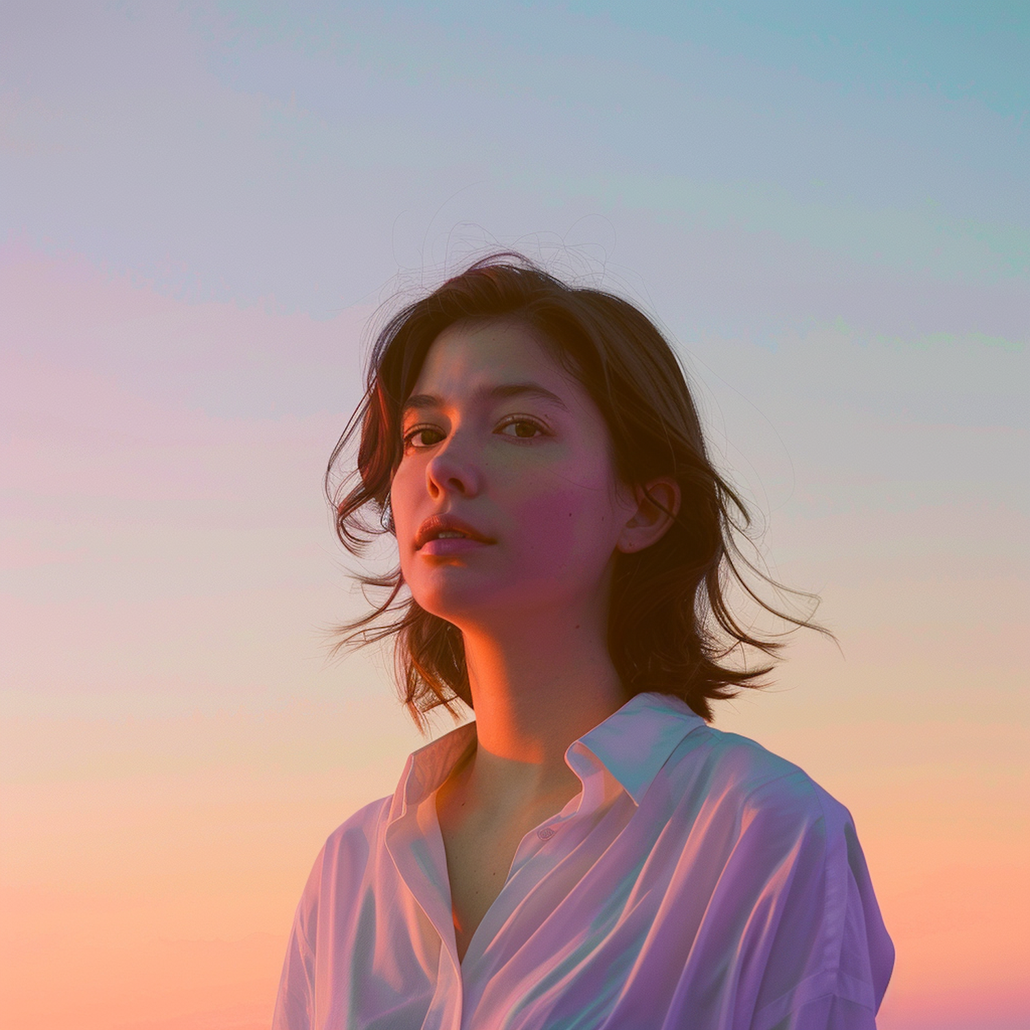 Young woman with short hair in a white shirt against a vibrant sunset sky, creating a serene and dreamy atmosphere.