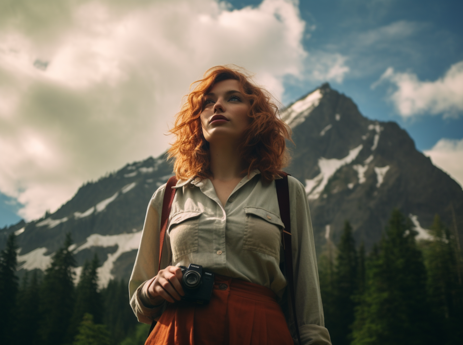 Red-haired woman with a camera in a mountainous landscape, wearing a green shirt and rust pants, against a backdrop of snow-capped peaks.