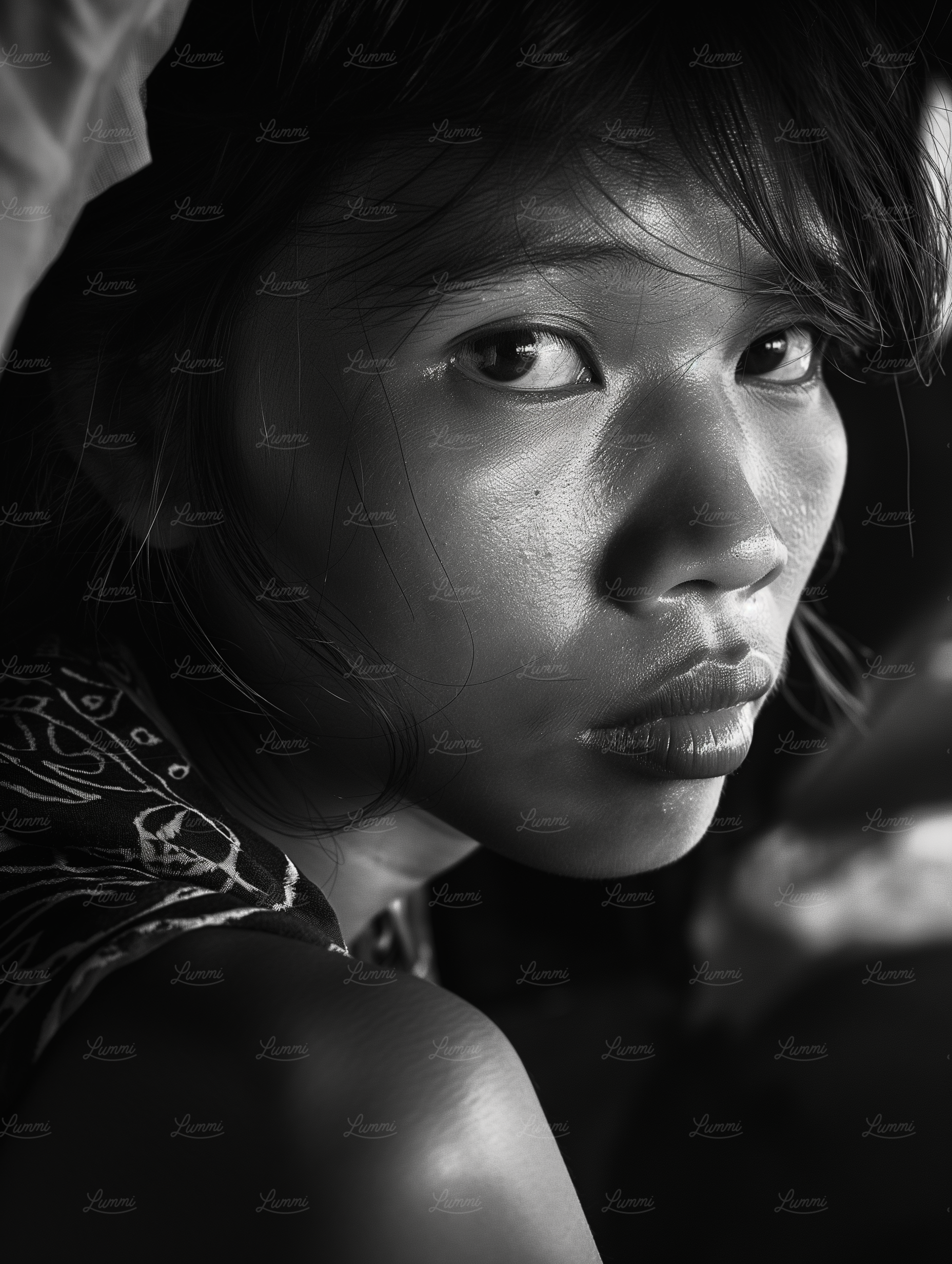 Black and white close-up portrait of an Asian woman with expressive eyes and contemplative expression, highlighting skin texture.