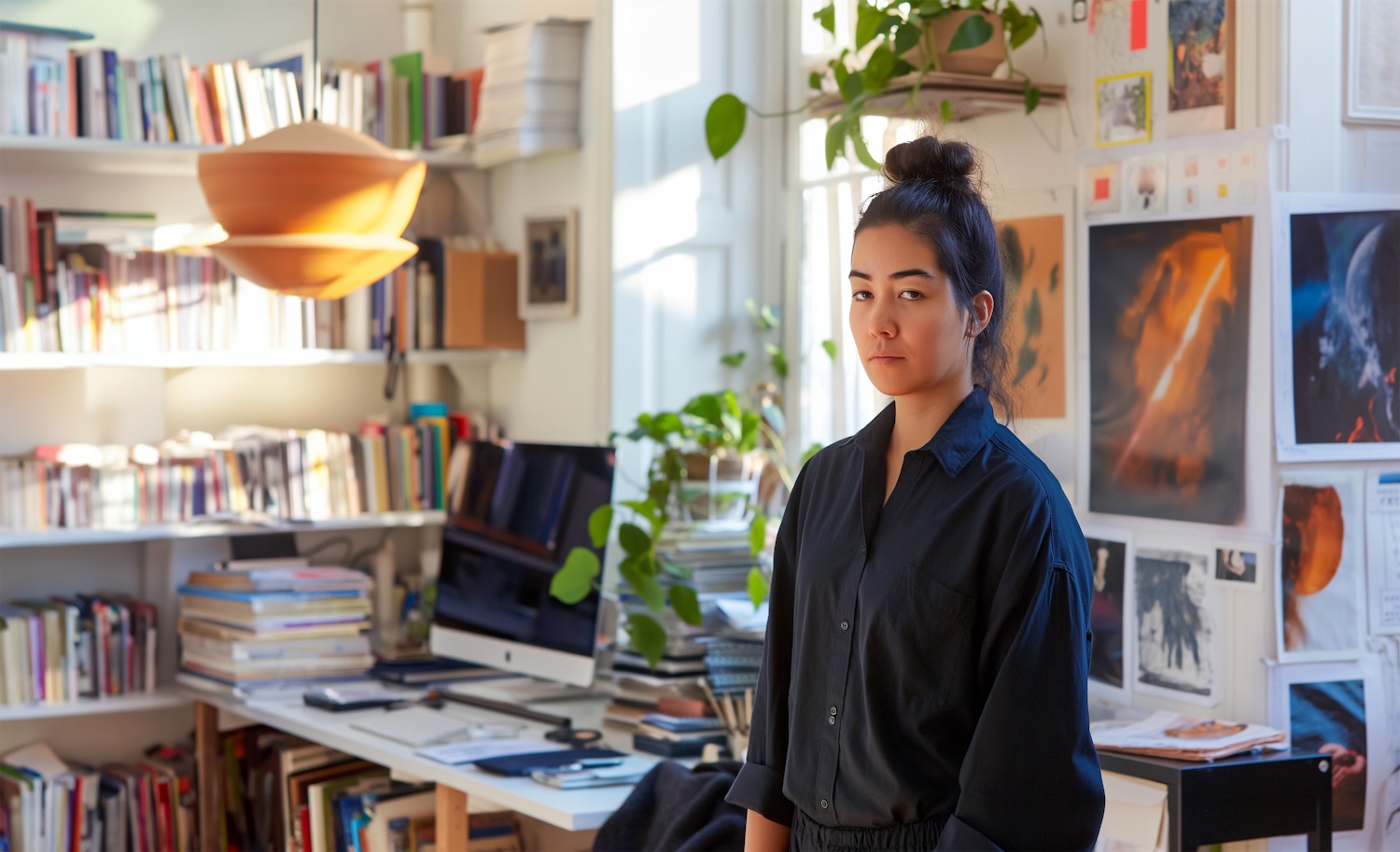 Asian woman in a black shirt stands in a bright, art-filled room with books, plants, and a computer, under a warm pendant light.