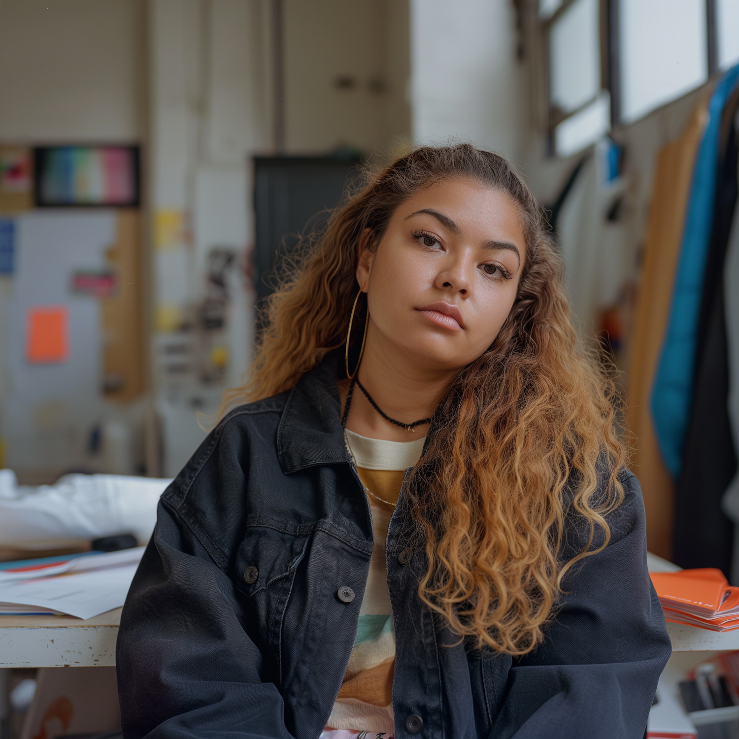 Young woman with wavy golden-brown hair, black denim jacket, and hoop earrings in a creative workspace with a calm expression.