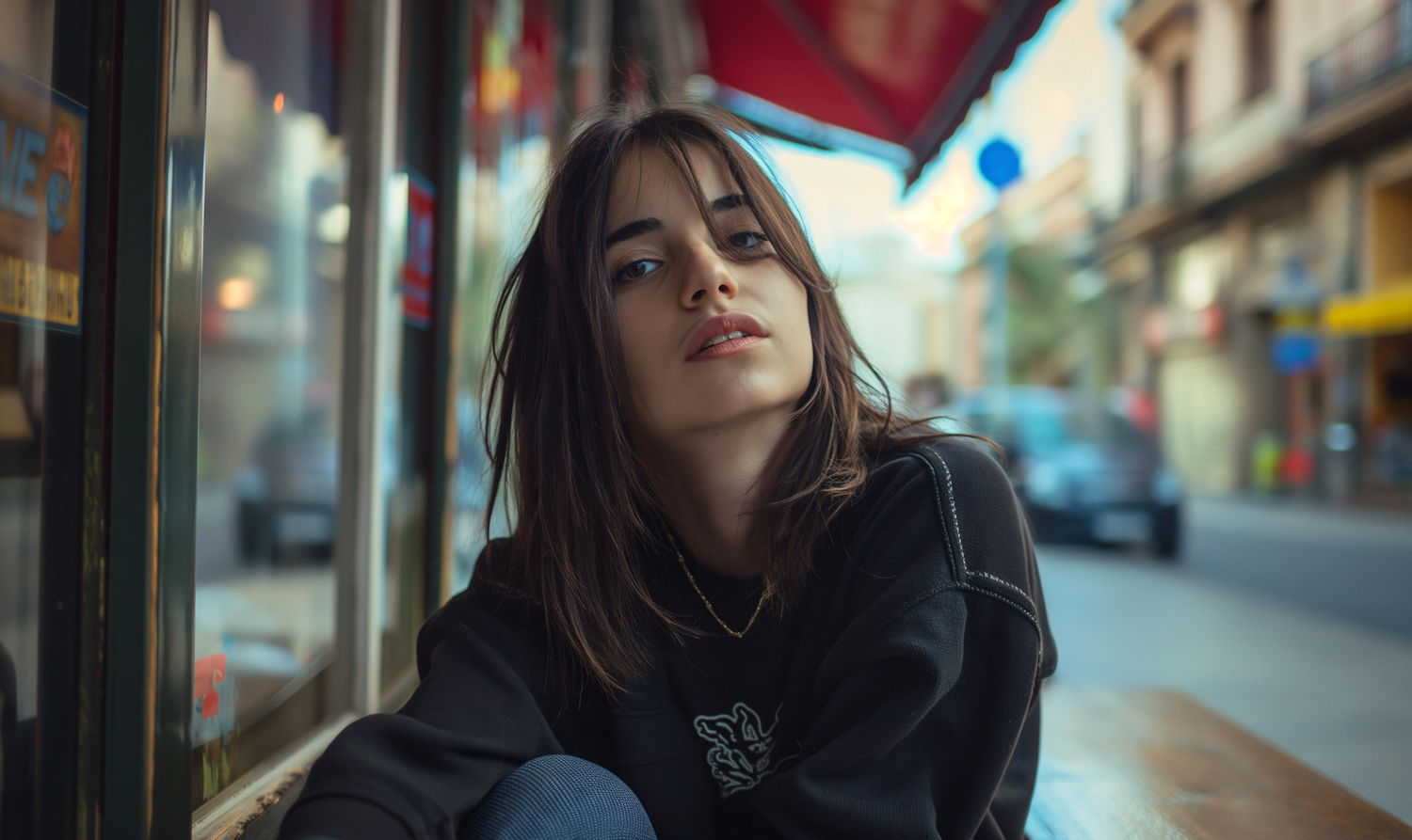 Young woman with dark hair and blue eyes sitting outside a café, wearing a black sweatshirt. Urban street scene in the background.