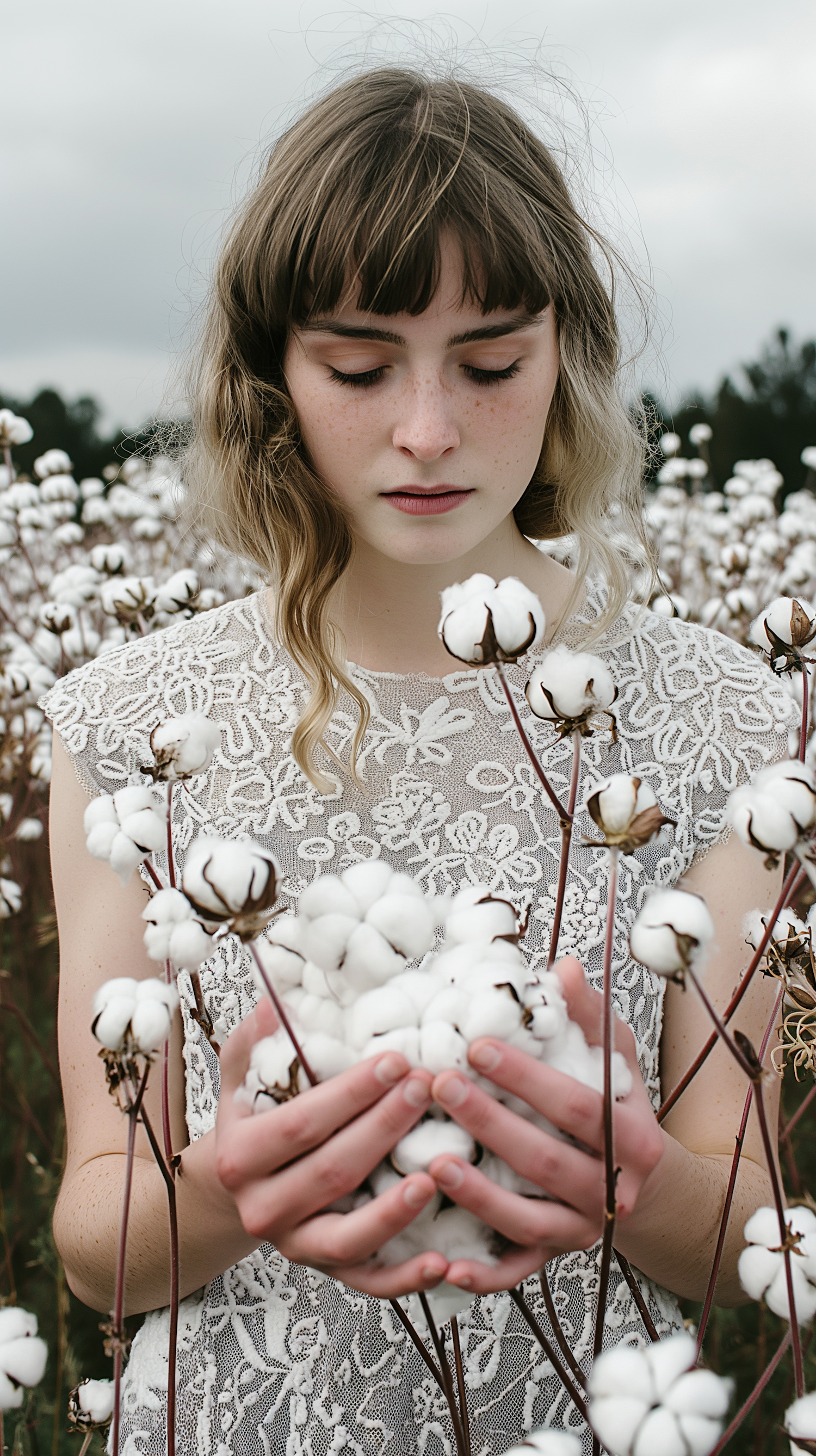 Young woman in a lace dress holding cotton in a serene field, surrounded by fluffy white cotton plants under an overcast sky.