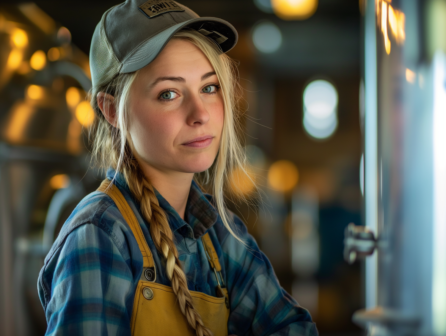 Young woman in a brewery wearing a plaid shirt, yellow overalls, and a cap, with a calm expression and warm industrial lighting.