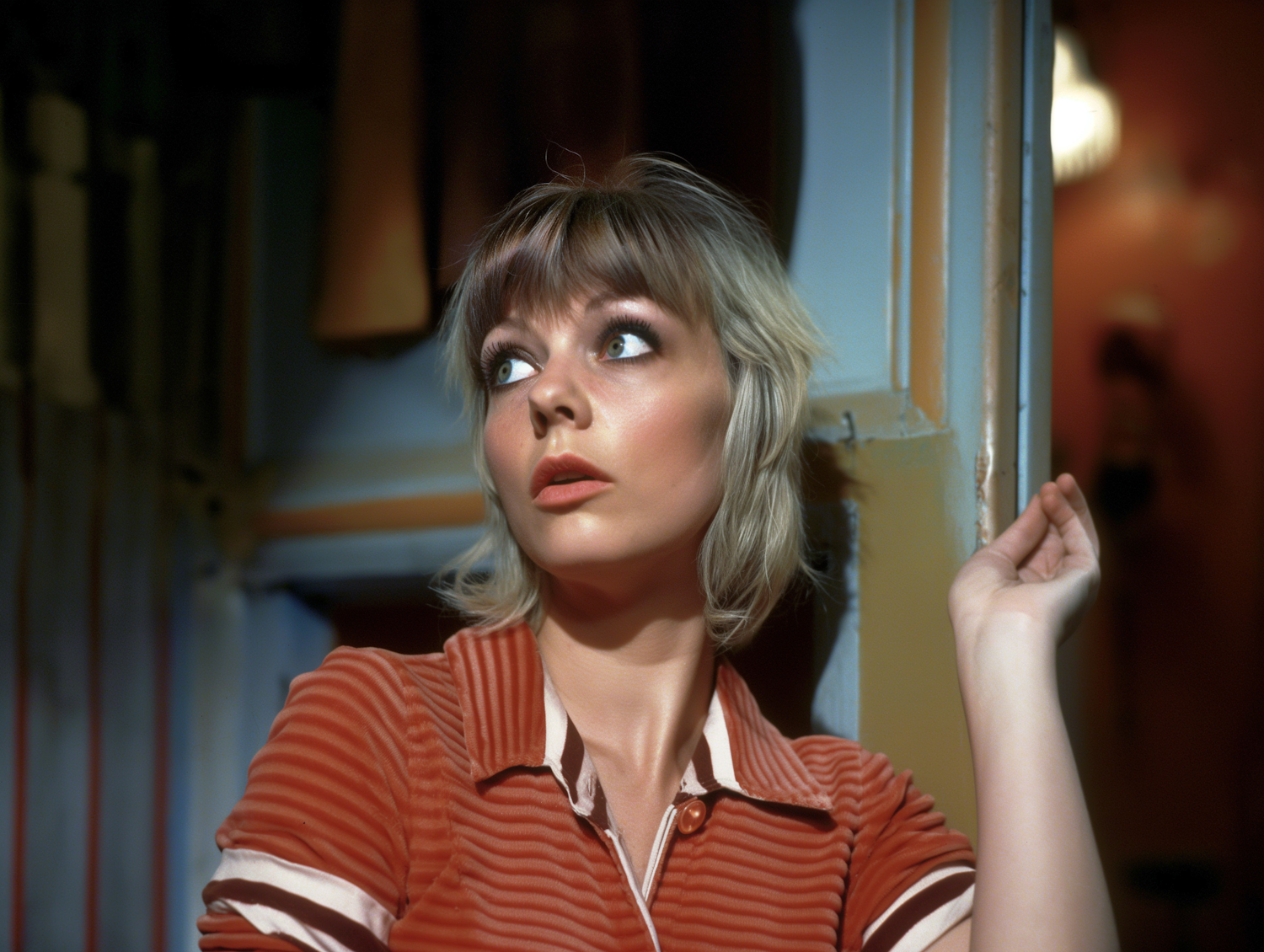 A blonde woman in a red striped shirt gazes upward thoughtfully in a dimly lit, vintage-inspired setting.