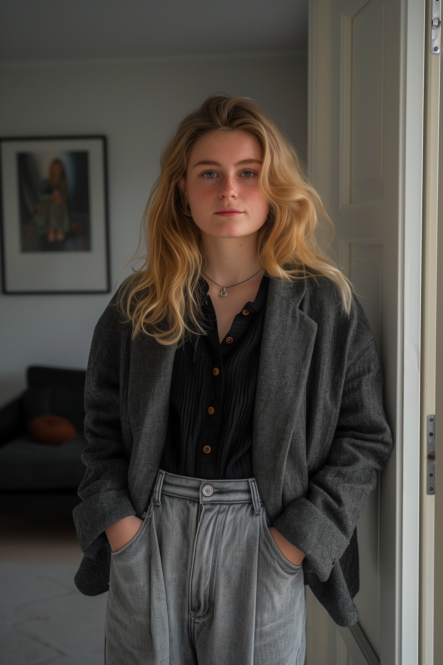 Young woman with blonde hair in a gray blazer and light trousers, standing indoors with a calm expression and minimalist style.