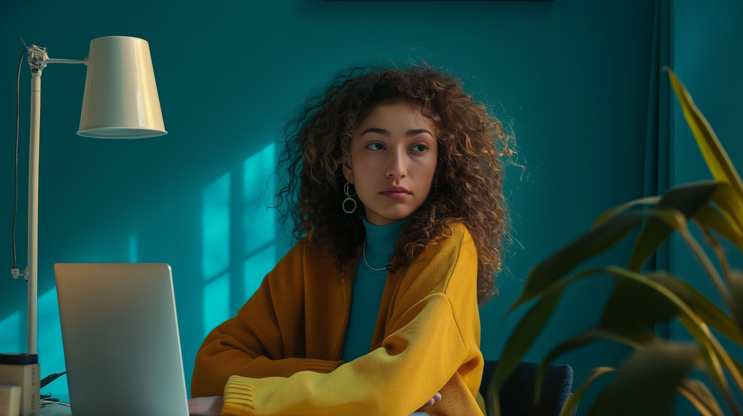 Young woman with curly hair in a yellow sweater, sitting at a desk with a laptop, teal background, and sunlight casting shadows.